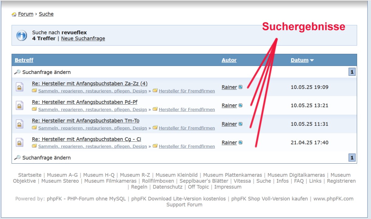Schade das die Suche über Suche keine brauchbare Ergebnisse liefert oder ich habe den Trick noch nicht gefunden ich gebe über Einfügen und die entsprechende Ergänzung wie z.b. Ba ein und was macht die Suche, die Suche ignoriert das BA und bietet nur die Liste über die Hersteller und ich muss mich durch die Liste (immerhin 8 Seiten durchhangeln) Das macht mir ganz sicherlich keine Freude Heute wollte ich eigentlich um die 150 Kameras von Revue einfügen aber verschiebe auf den Herbst in der Hoffnung das dann was geht. Unter Balda habe ich heute einen Beitrag eingegeben der aber nicht zum Erfolg geführt hat und nach neuerlichem Aufruf nicht mehr da war.