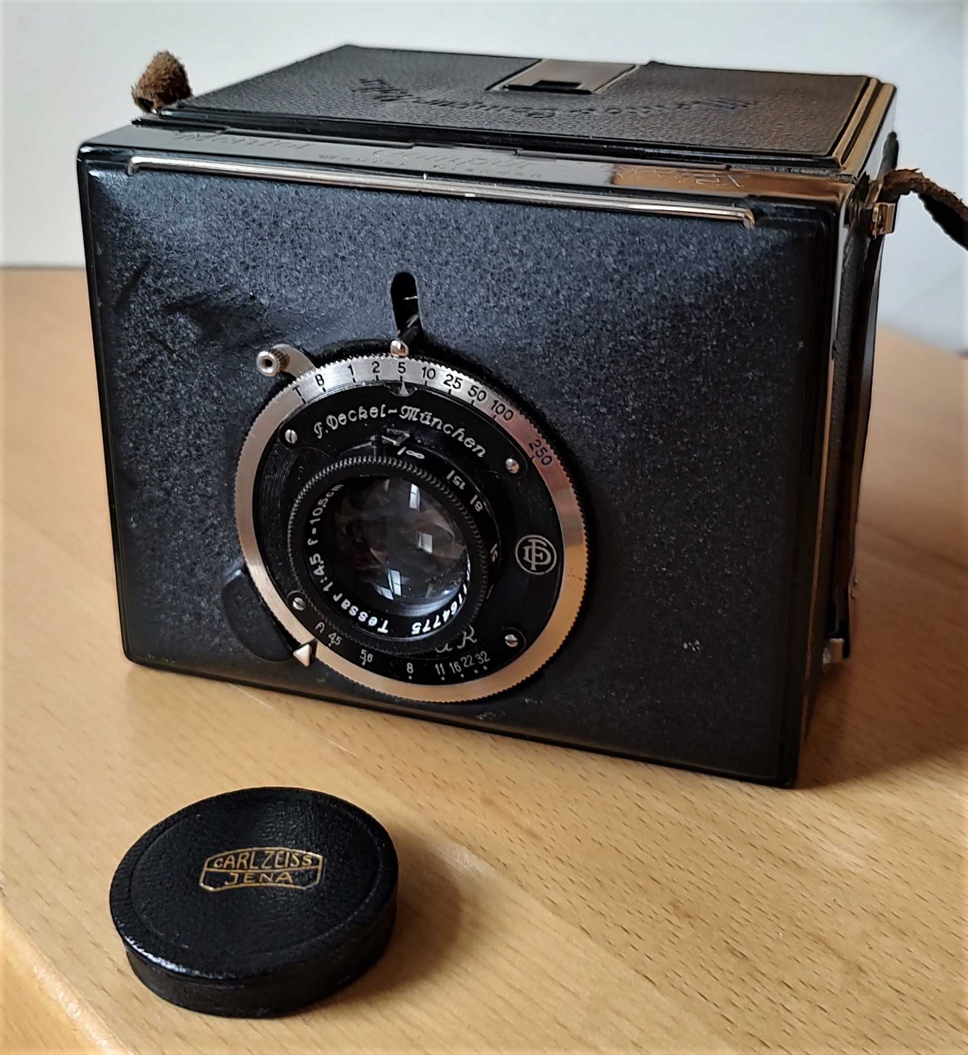 - ein hochwertiges Objektiv (Carl Zeiss Tessar 1:4,5 / 10,5) mit Zentralverschluss (Compur): T, B, 1 – 1/250 Sekunde, Blende 4,5 bis 32, Entfernungen 1,5 bis Unendlich; mit originalem Zeiss-Leder-Objektivdeckel;