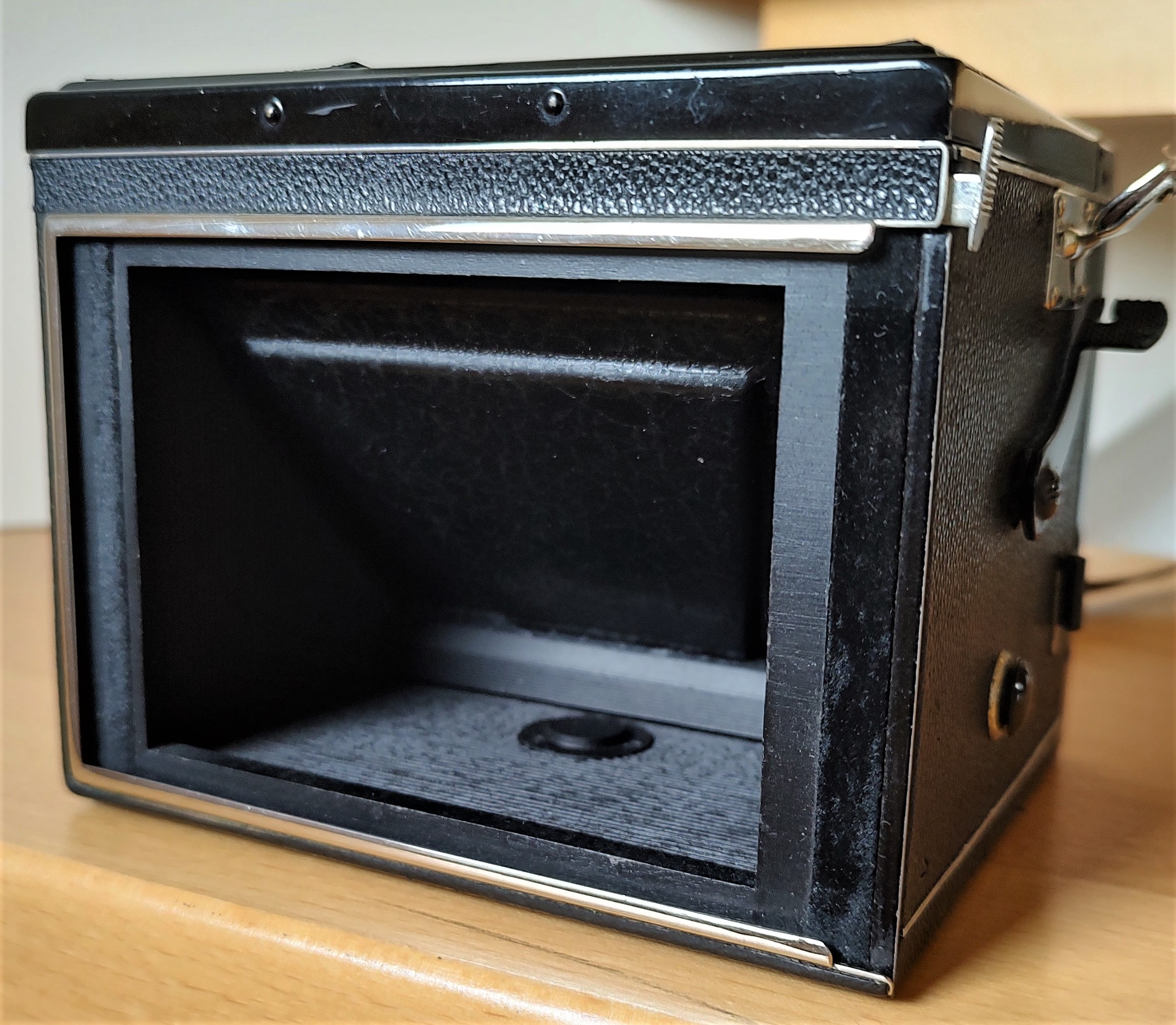 Die boxförmige Kamera wurde ca. 1930 gebaut und zeichnet sich durch folgende Besonderheiten aus: