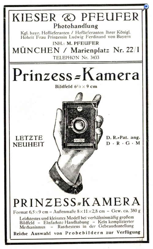 Also: keine Rodenstock, vielleicht von Spitzer (auch) vertrieben....denn auf 2 der bekannten Prinzessinen sind auf 2 genieteten Plaketten ist folgendes zu lesen: "Kieser & Pfeufer, Hoflieferant, München" und "Prinzess D.R.G.M." Nun ist mir klar, dass Kieser & Pfeufer eigentlich auch kein Kamera-Hersteller ist. Warum aber haben beide Plaketten genau die gleiche Schrift und die gleichen Verzierungen?