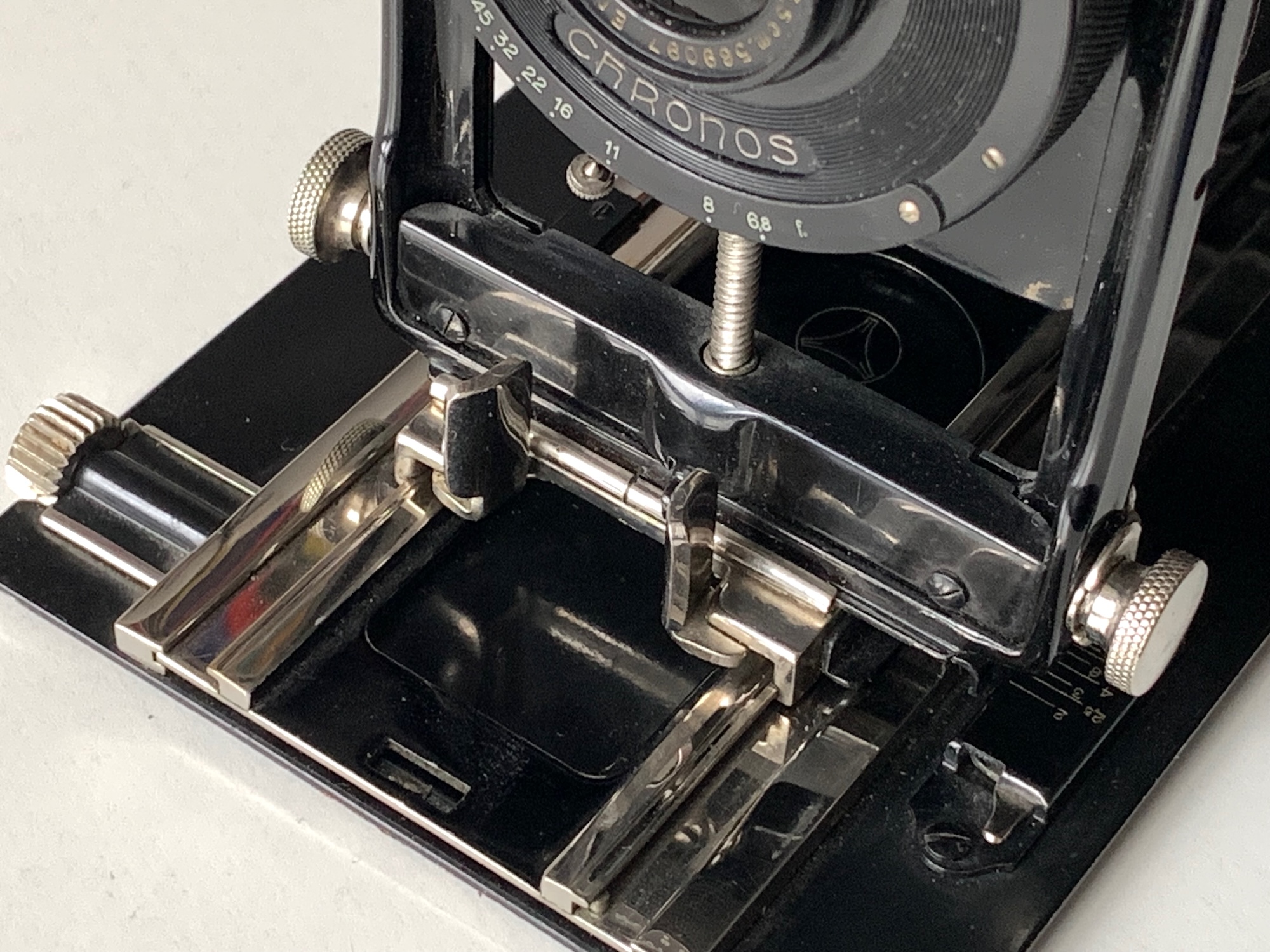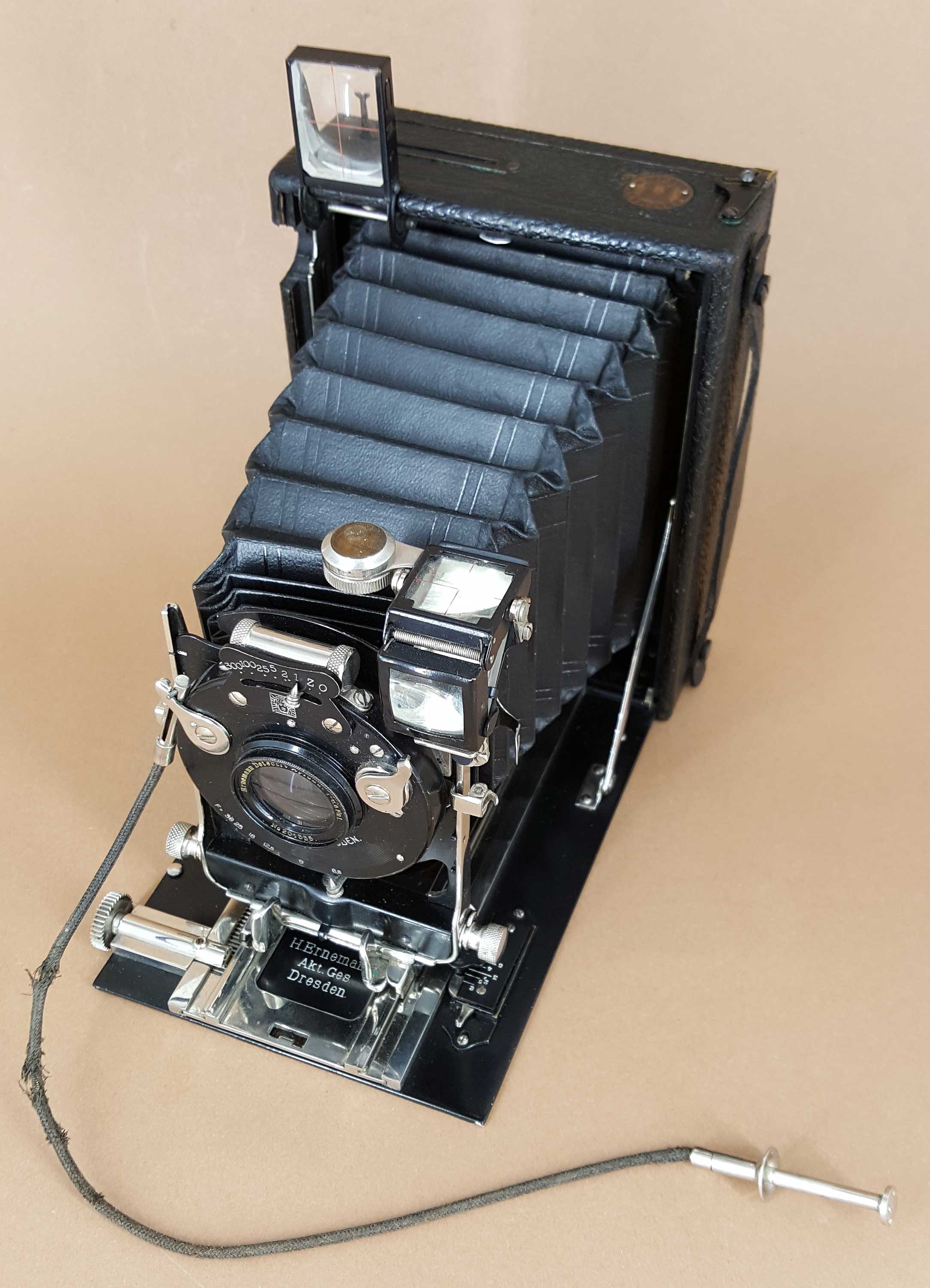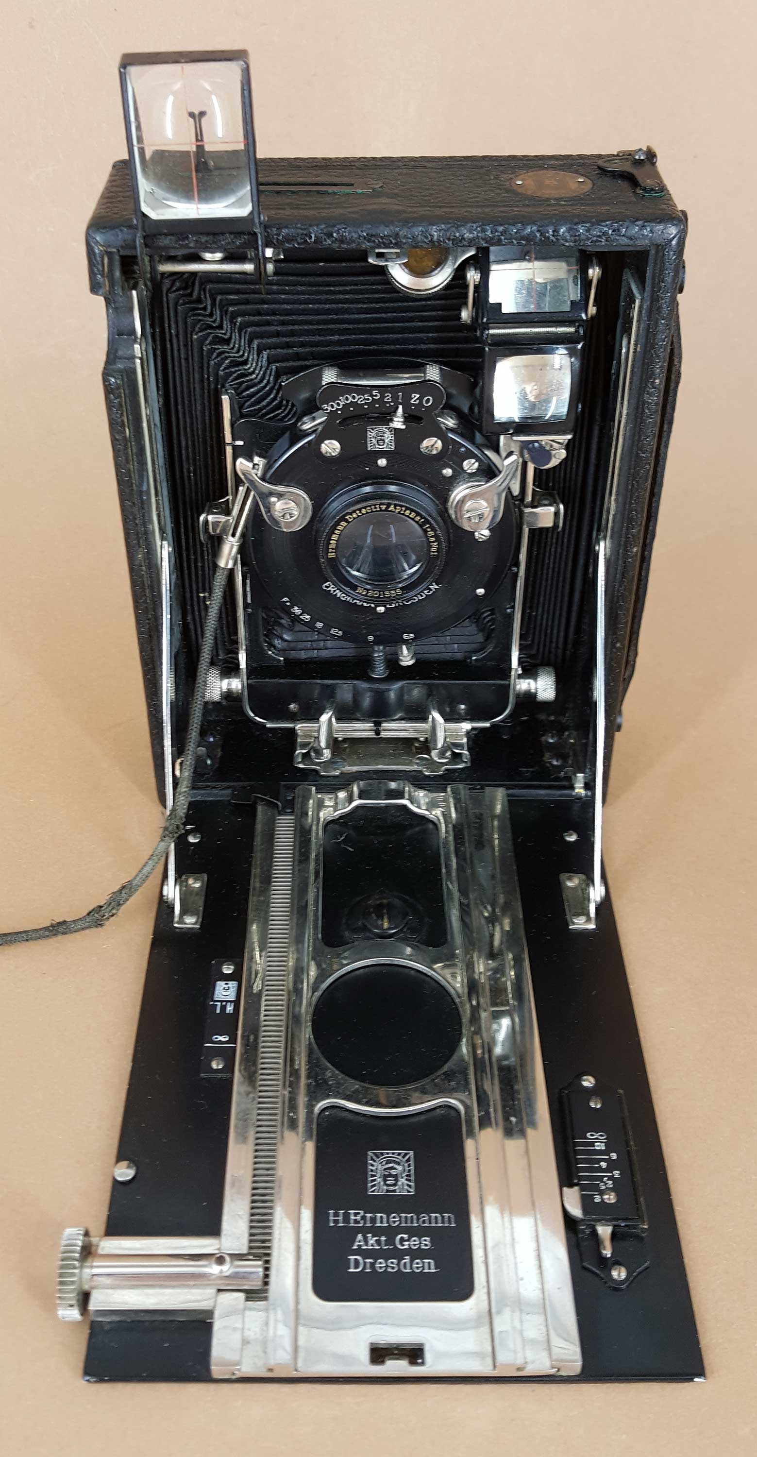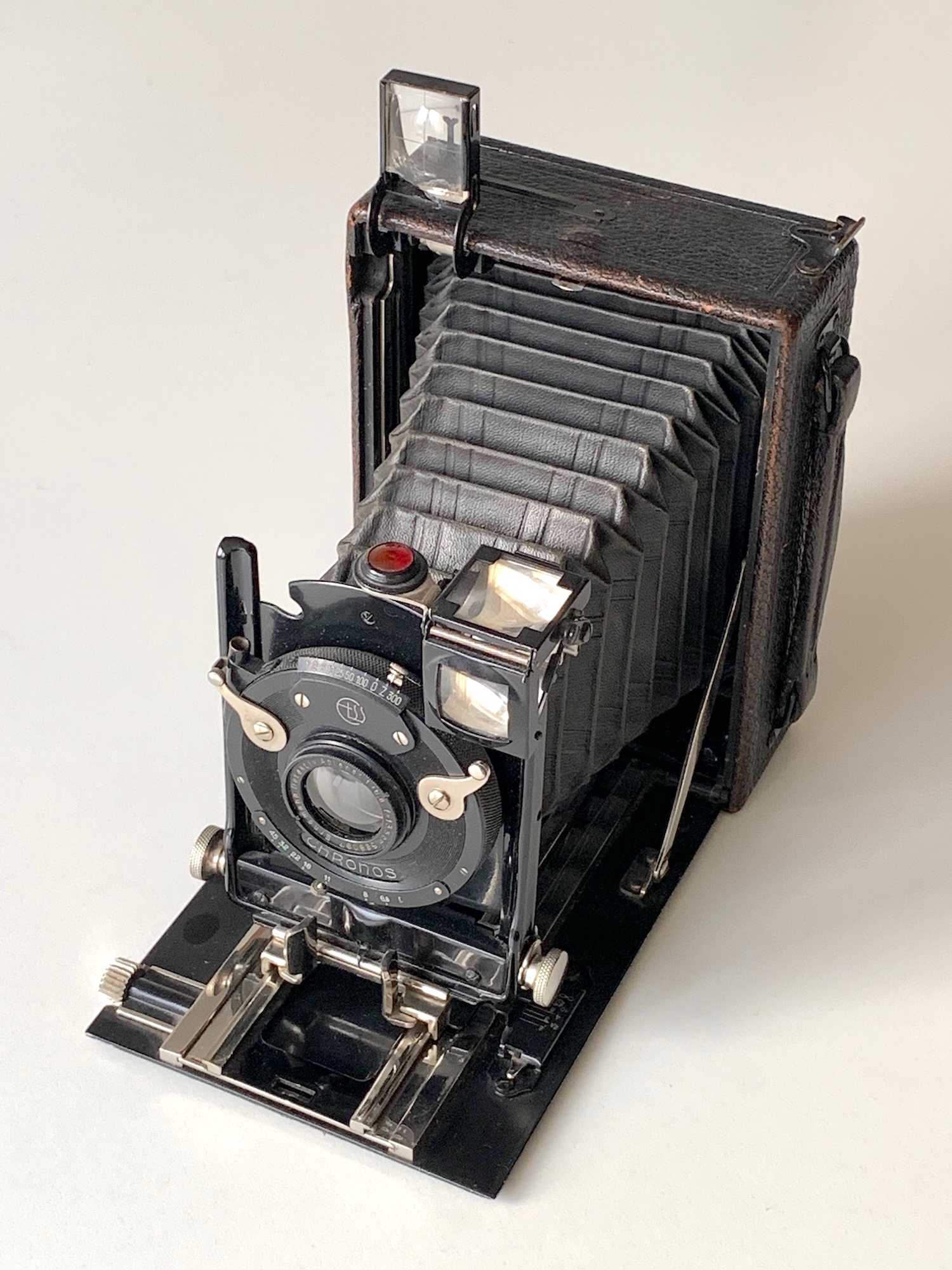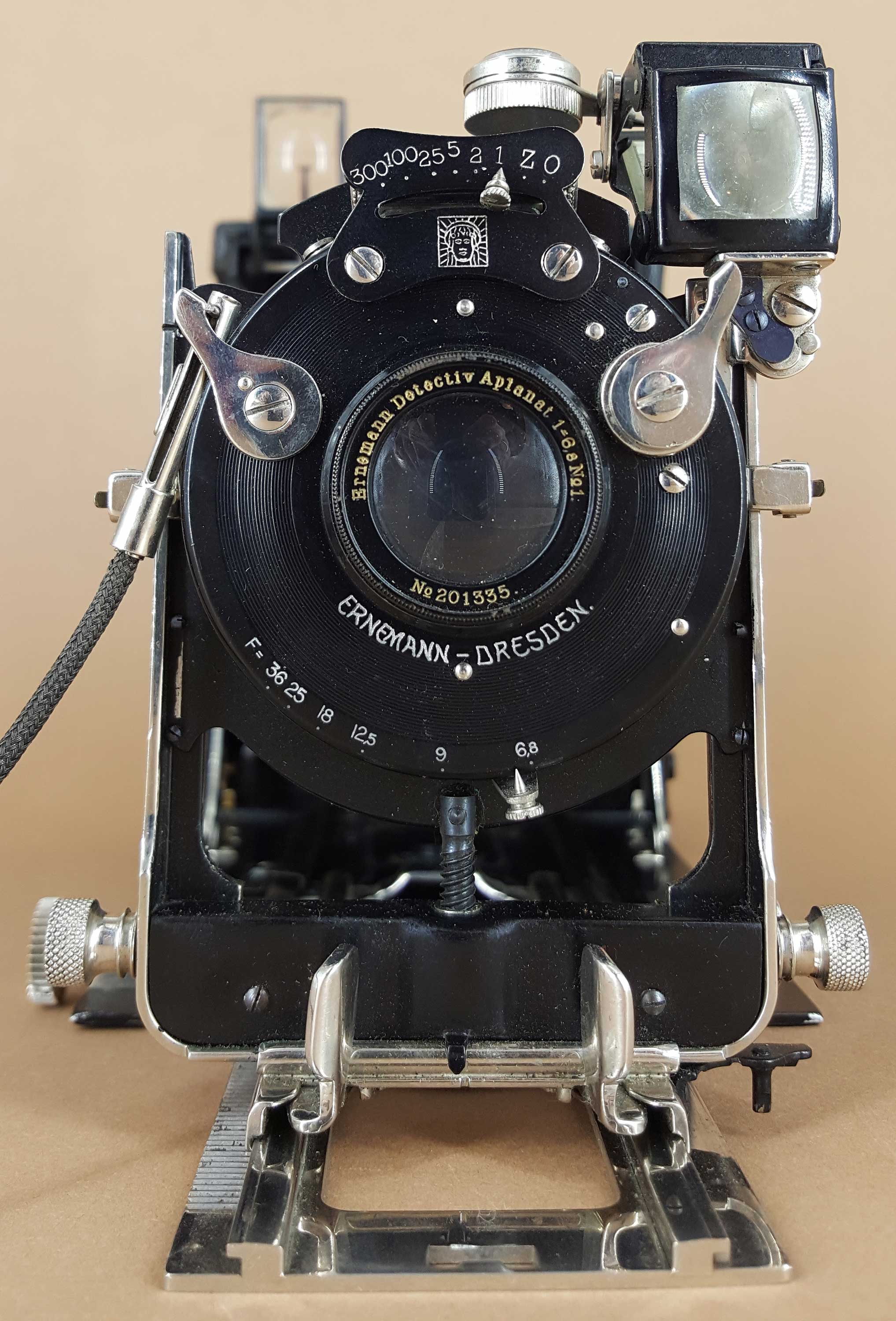 Das vorliegende Exemplar ist mit dem mäßig lichtstarken Detektiv-Aplanat 6,8/13,5 im Sektoren-Verschluss Chronos (1–300) ausgestattet.