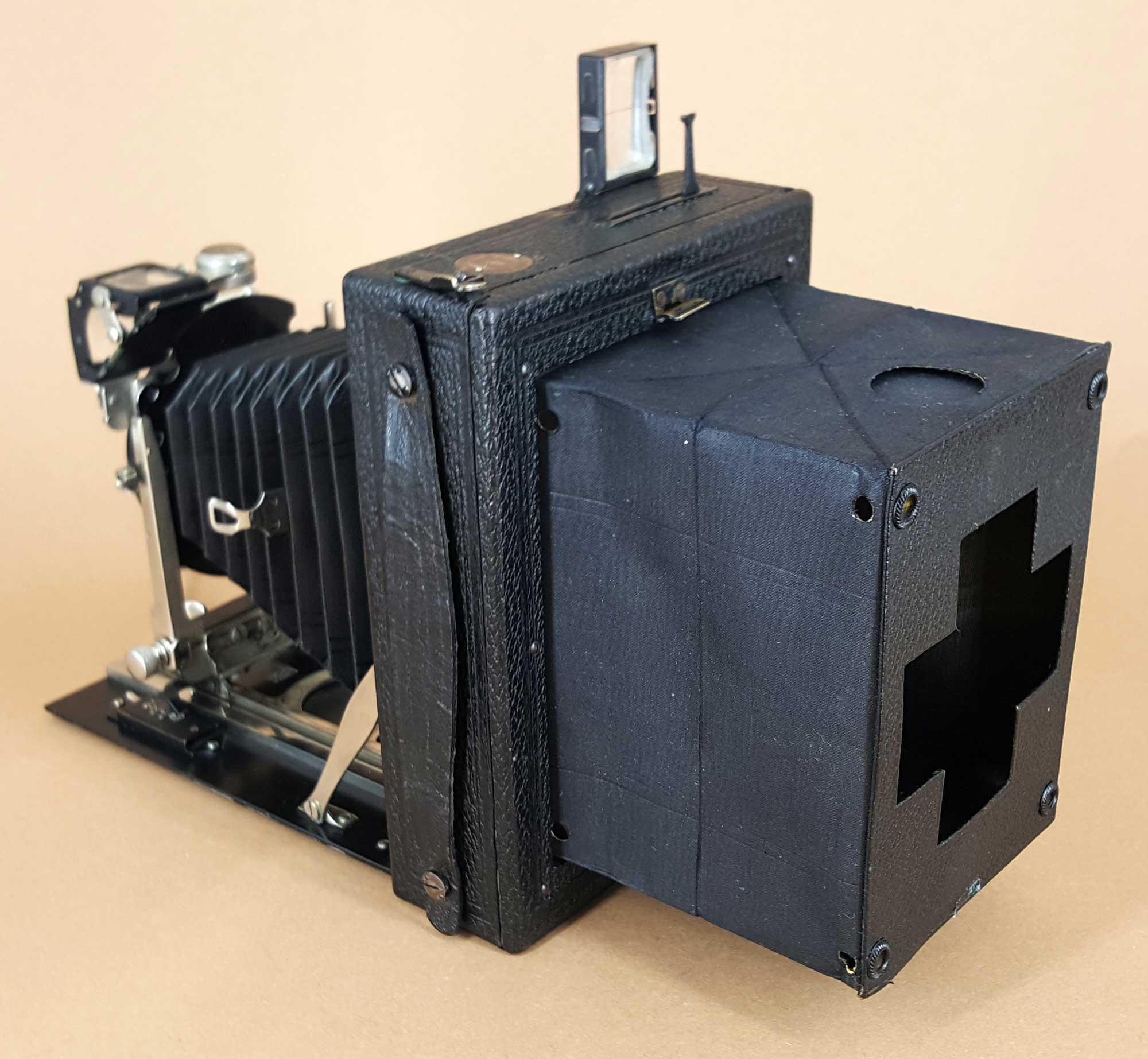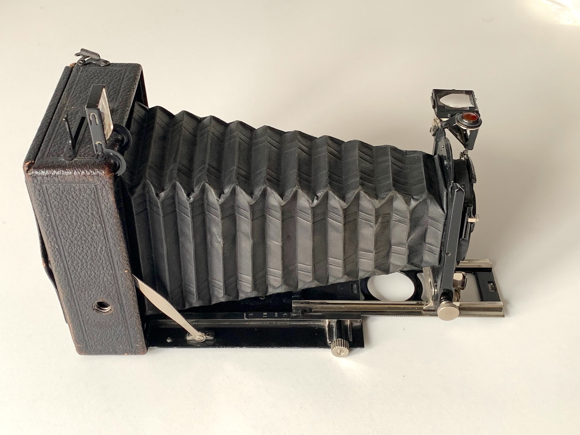 Das dürfte dann die Ausführung sein, die noch im Katalog 1912 abgebildet ist. Vermute ich richtig, dass sie das klassische Ernemann-Mattscheibenrückteil mit kreuzförmigem Einblick besitzt? – Interessant, dass Dein Modell im Gegensatz zu meinem auch Balgenspanner hat; eigentlich waren die bei den Kameras mit doppeltem Auszug ja üblich, bei meinem wurden sie offenbar eingespart (es gibt auch keinen Hinweis, darauf, dass da etwas fehlen oder abgerissen sein könnte...).