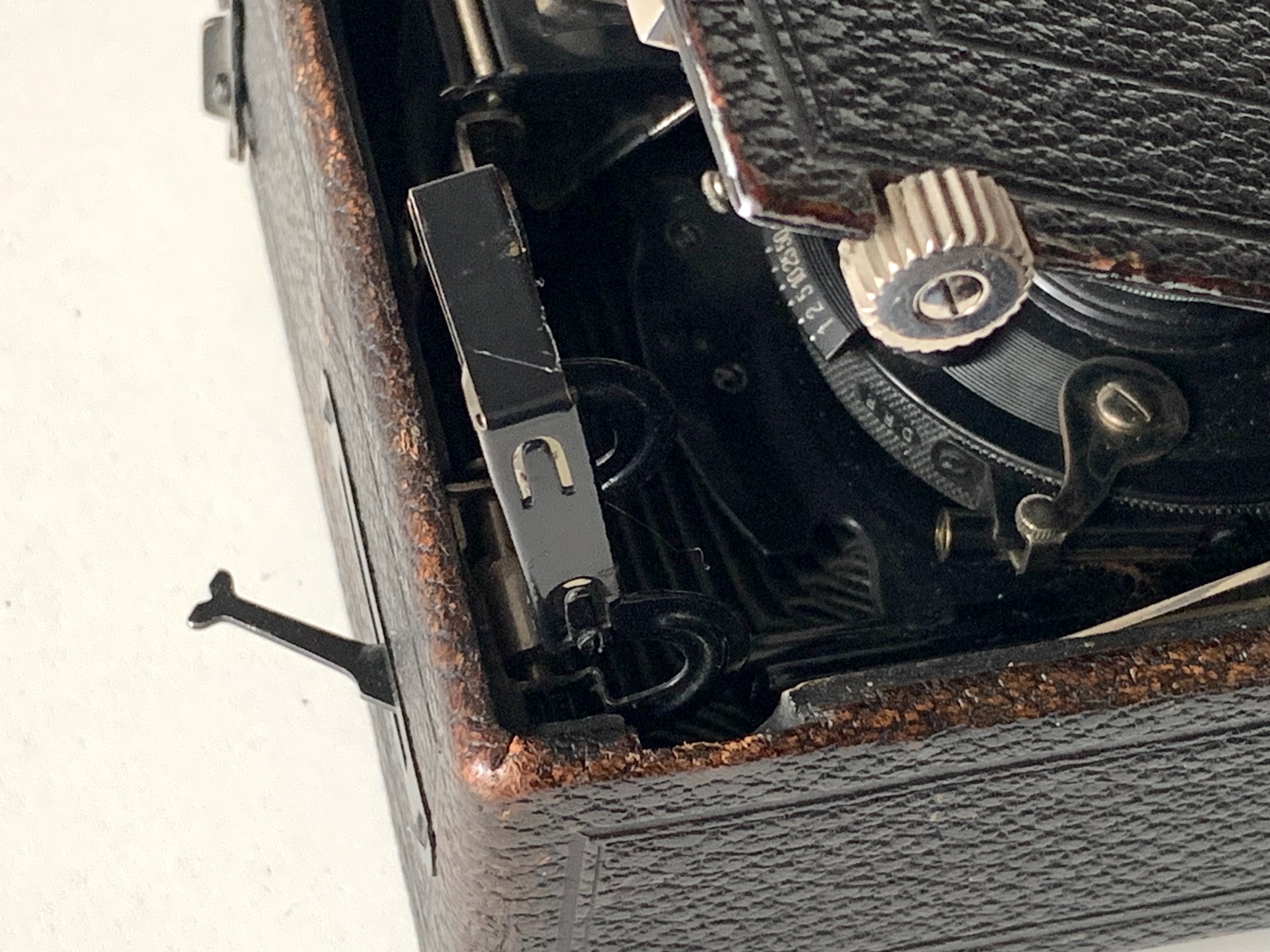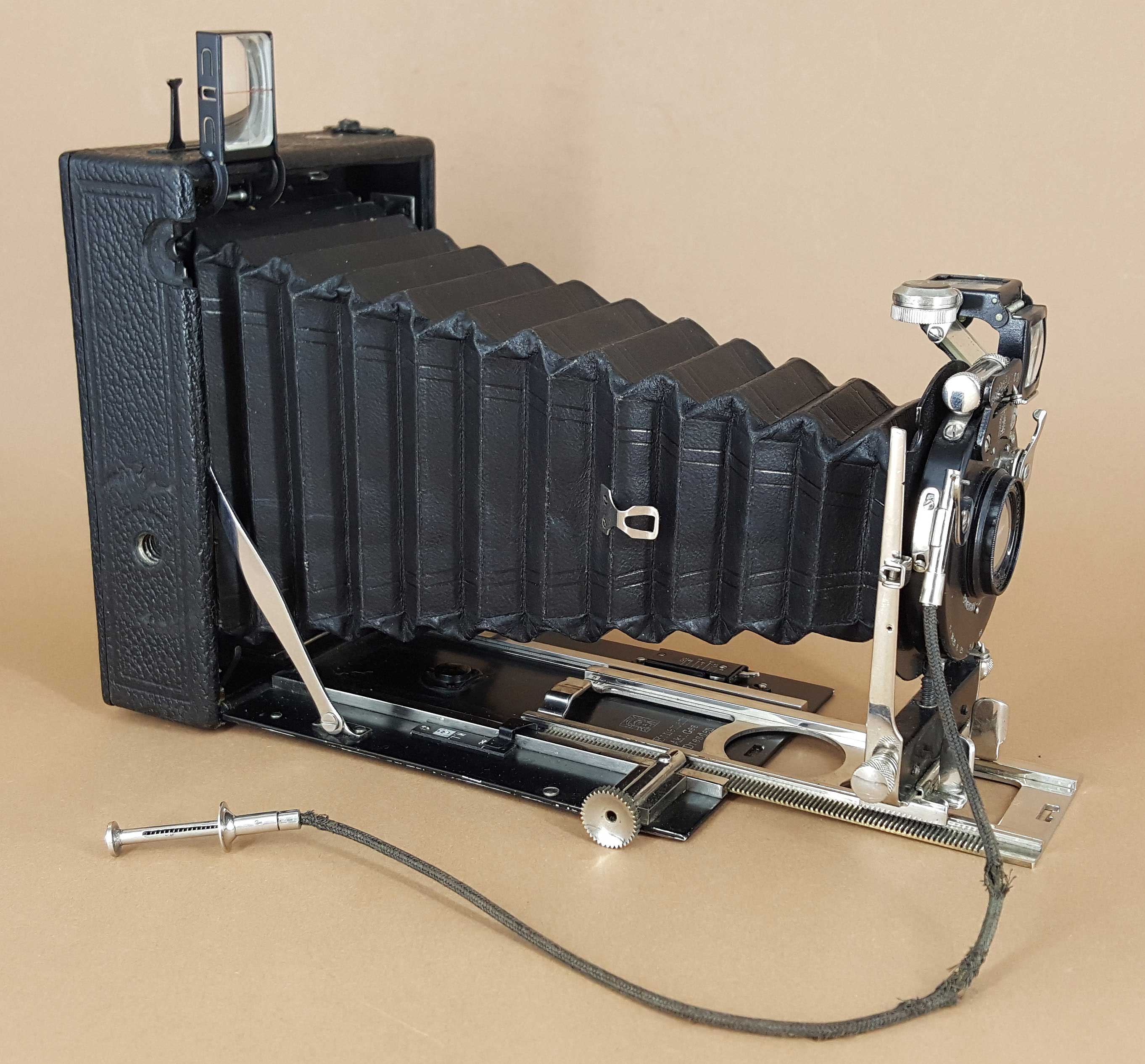 Die Sache mit den fehlenden Balgenspannern bei Deinem Exemplar ist mir erst nach Deinem Hinweis aufgefallen. Die Kamera ist jedoch auch im 1914er Katalog ohne Balgenspanner dargestellt und sämtliche online verfügbare Exemplare besitzen ebenfalls keinen Spanner. Es wird also werksmäßig auf den Spanner verzichtet worden sein.