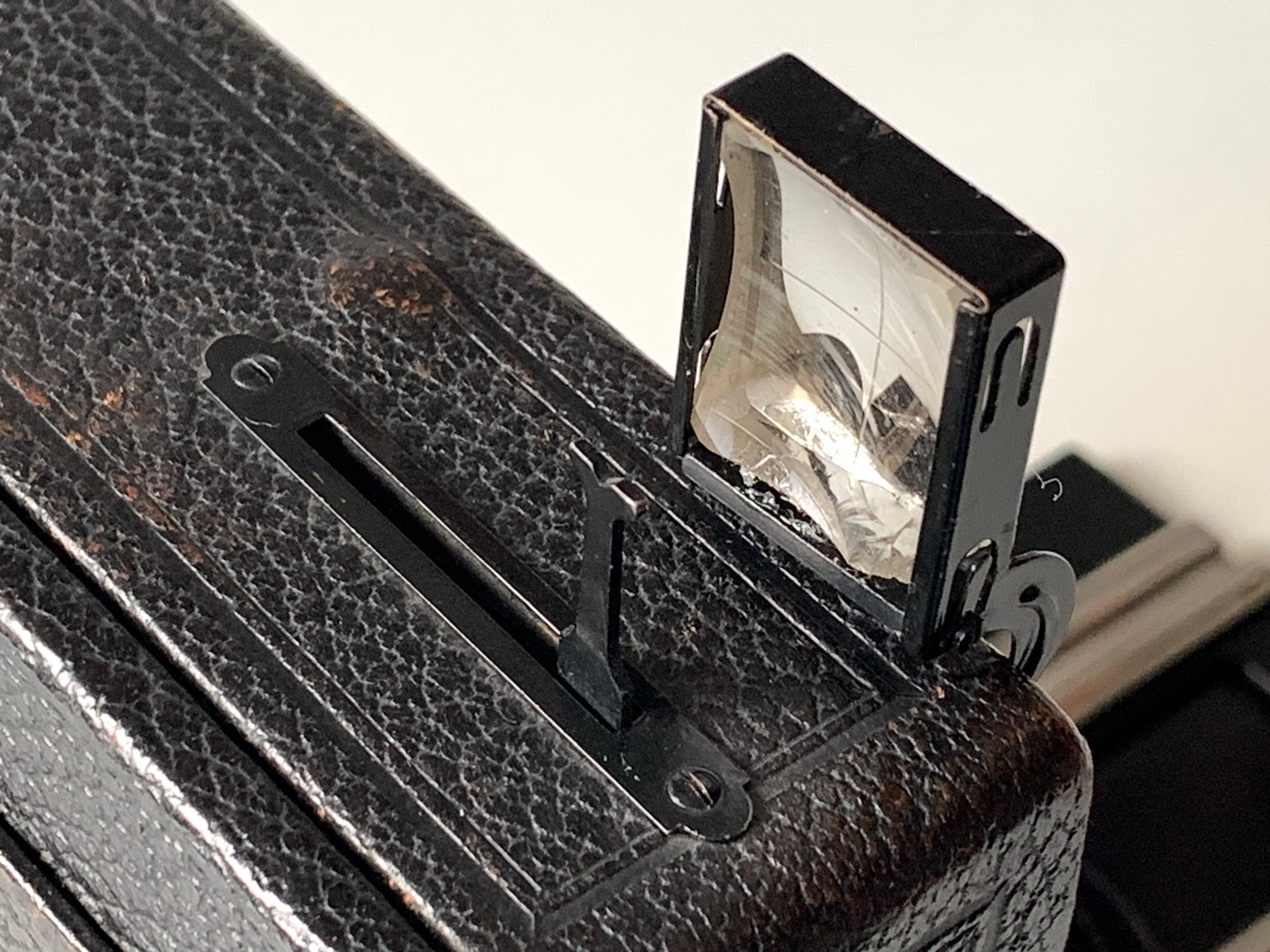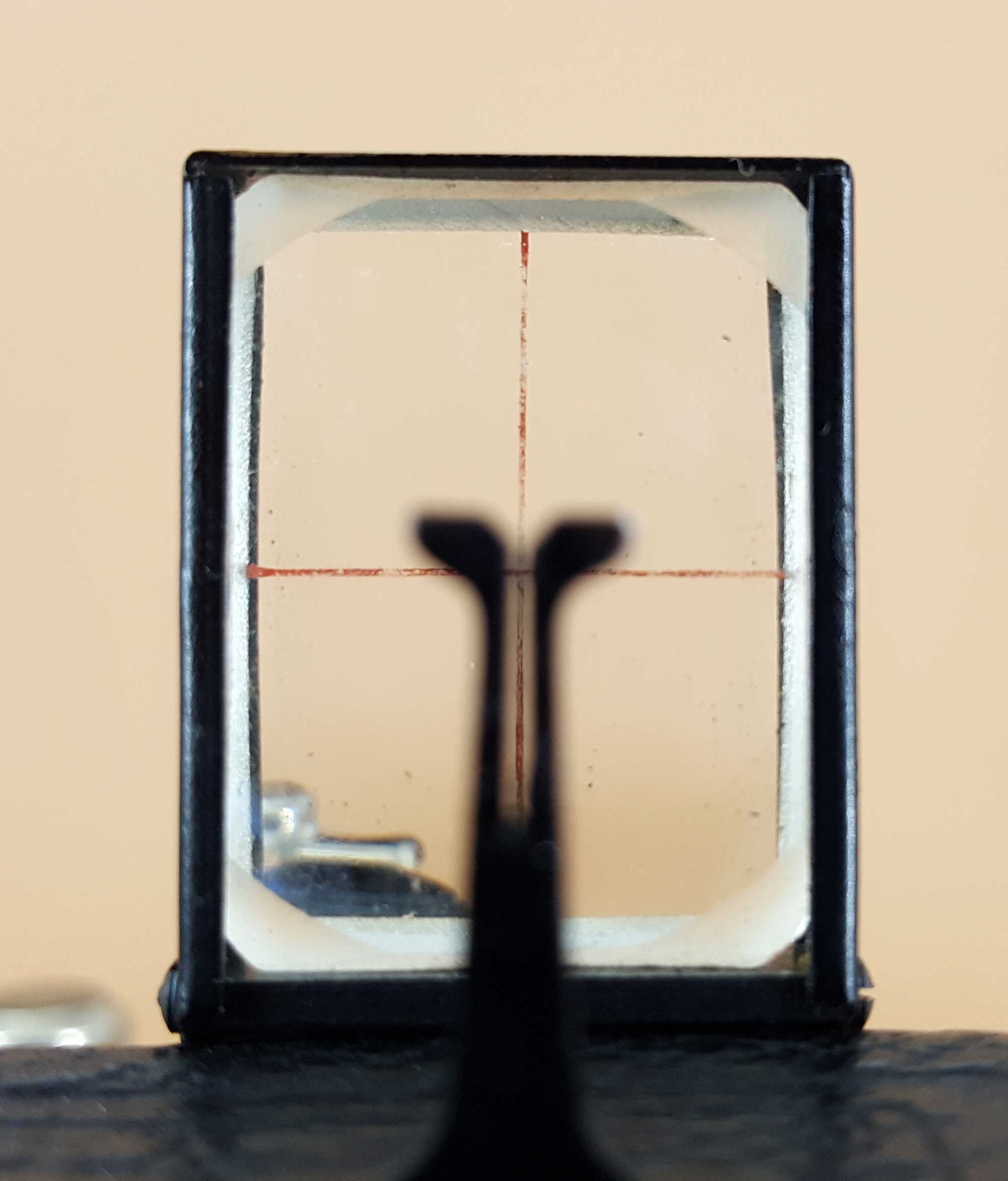 Der Clou ist der Newtonsucher, der beim Öffnen gemeinsam mit dem Visier automatisch ausklappt. Leider hat das Glas einen Chip, die Mechanik funktioniert aber noch immer einwandfrei.