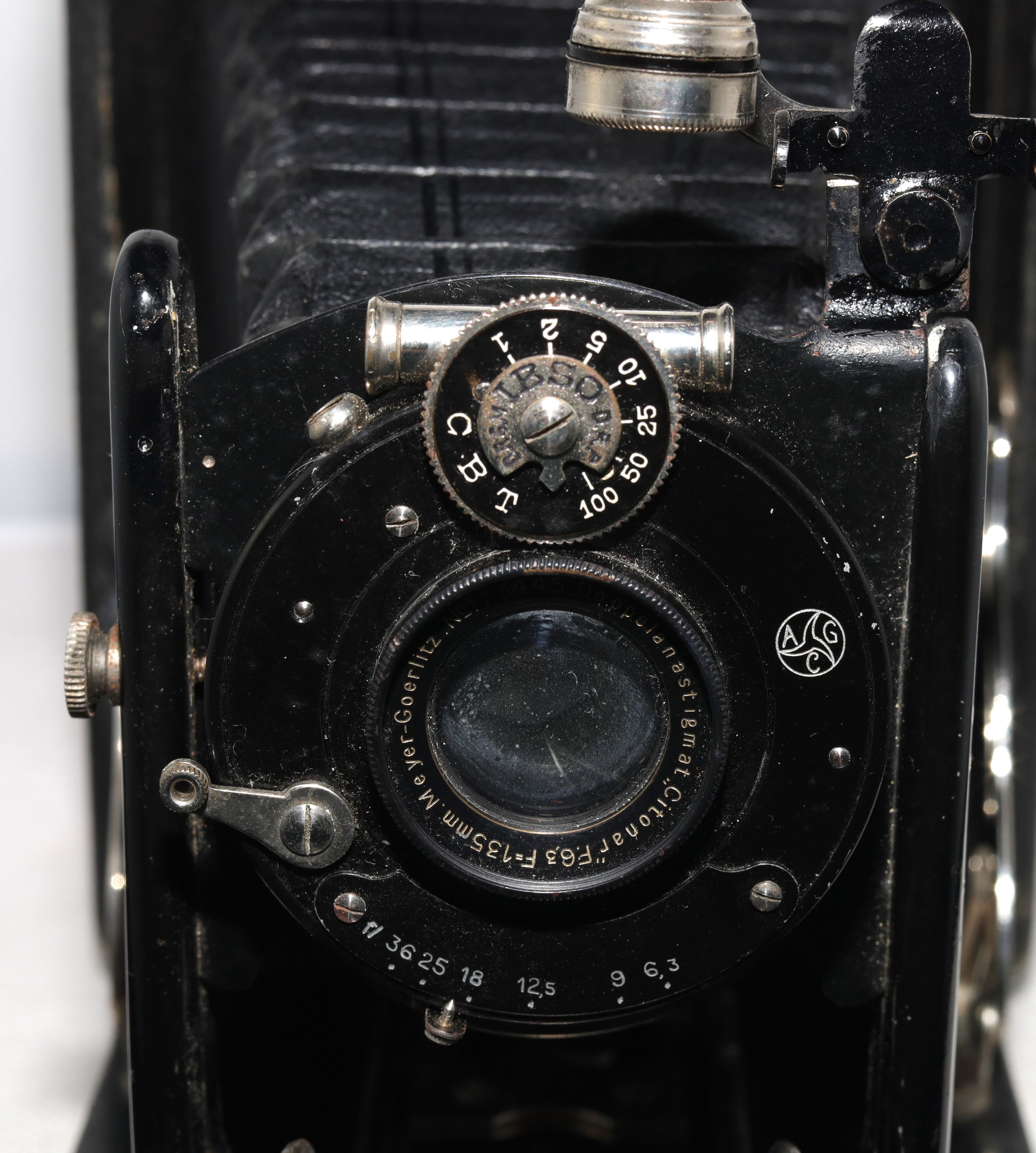 ich habe die Contessa Nettel Altura Nr. 70 gefunden. Die Maße stimmen Meyer Görlitz Citonar f 1/6,3 mit F: 135 mm. Doch leider findet man kein Bild. Zeit könnte auch mit dem Alter des Objektivs 1921 übereinstimmen. Dafür spricht auch der der IBSO-Verschluss.