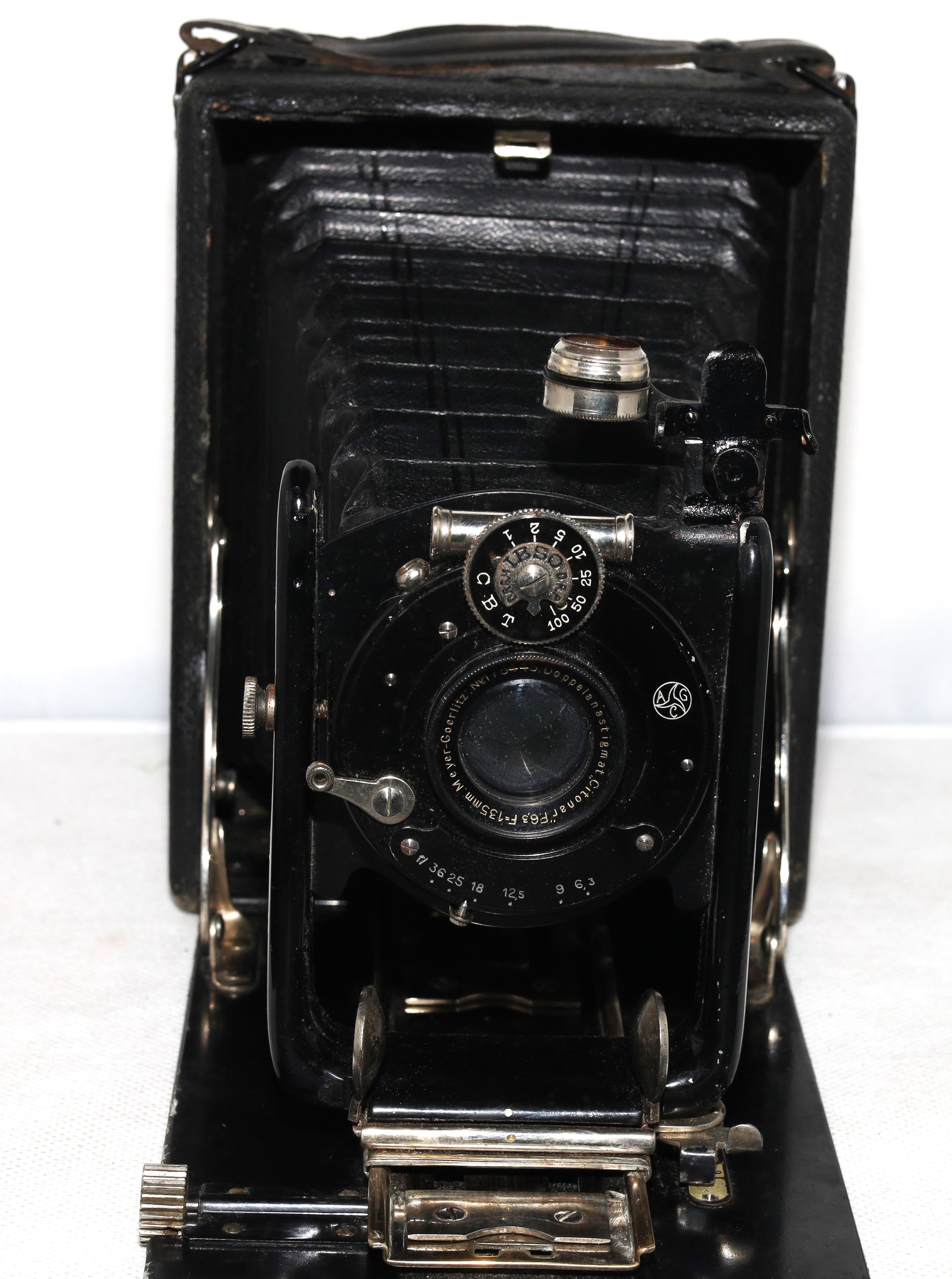 Es ist eine 9x12 Plattenkamera mit einem belederten Holzgehäuse. Bei dem Görlitz Objektiv aus dem Jahr 1921 handelt es sich um ein Doppelastigmat Citonar 1:6,3 und F: 135mm, der Verschluss ist ein Compound?/Ibso.