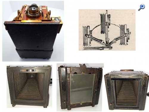 Beledertes poliertes Mahagonigehäuse Laufboden, Objektivträger und Platte ebenfalls aus poliertem Mahagoni Alle Metallteile sind aus poliertem Messing, teilweise vernickelt. Der Balgen für doppelten Auszug ist aus rotem Leder und innen mit Stoff gefüttert