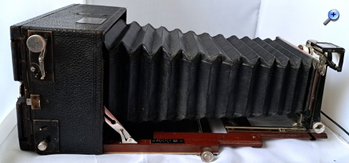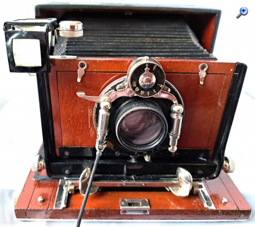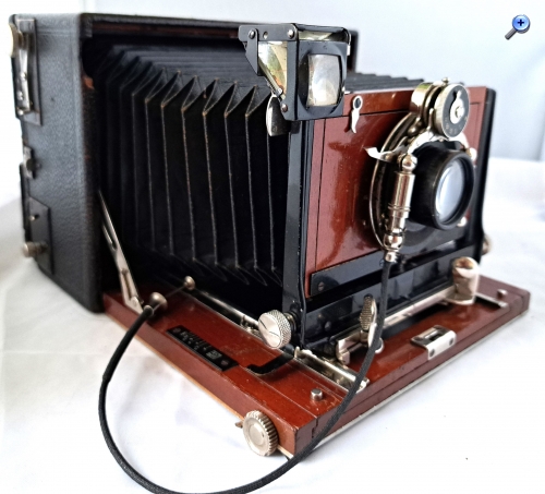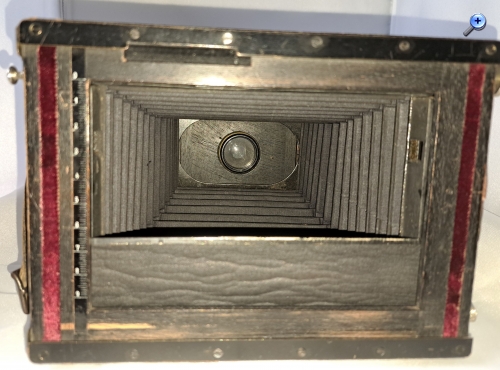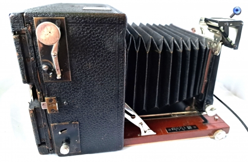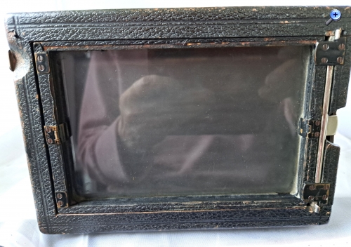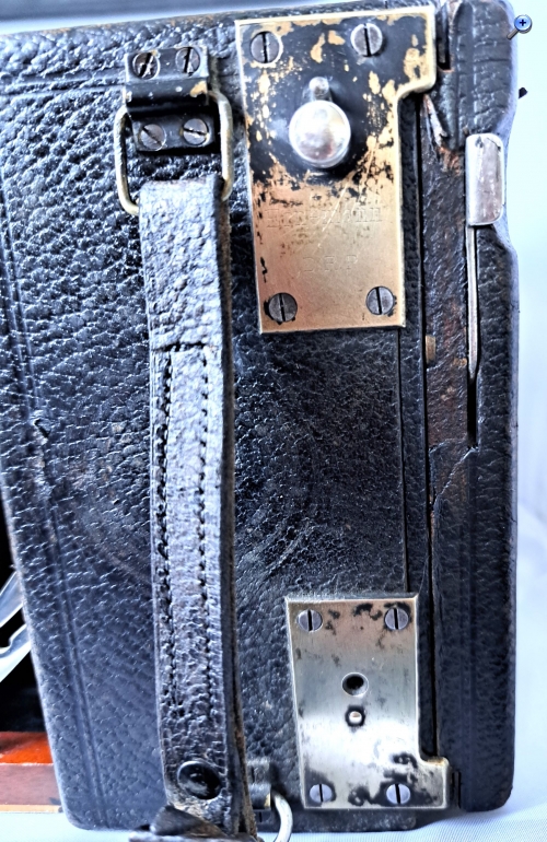 Das Kameragehäuse liegt im 10x15 vor, besteht komplett aus lederbezogenem Mahagoni. Ebenfalls aus Mahagoni ist der herausnehmbare Objektivträger, Laufboden und Schlitten sind ganz aus Holz und lagern auf einer belederten Metallplatte (Magnalium?/Aluminium).