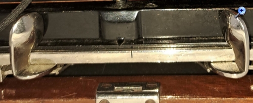 Sogar der dritte Auszug bewegt sich nach Drücken der Sicherungsknöpfe sehr geschmeidig. Man kann über diese Schreinerkunst nur staunen. Die Laufschienen sind aus vernickeltem Metall, vermutlich Messing.