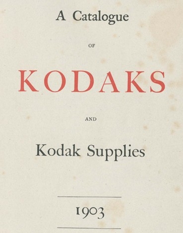 1888 Titelblatt "The Kodak Camera, 1892 Titelblatt Kodak Cataloque und auf der Innenseite "Cataloque of Kodak", 1896 Titelblatt Kodaks, ab 1898 Formulierung des Katalogtitels Kodaks, ab 1901 Deckblatt Kodak, zweites Blatt "Kodak and Kodak Supplies".