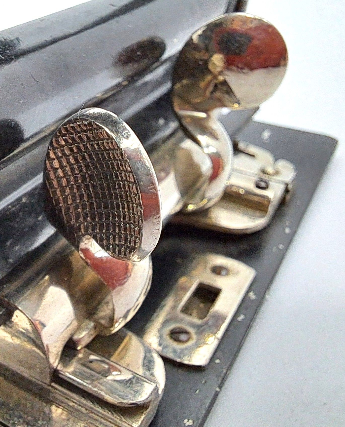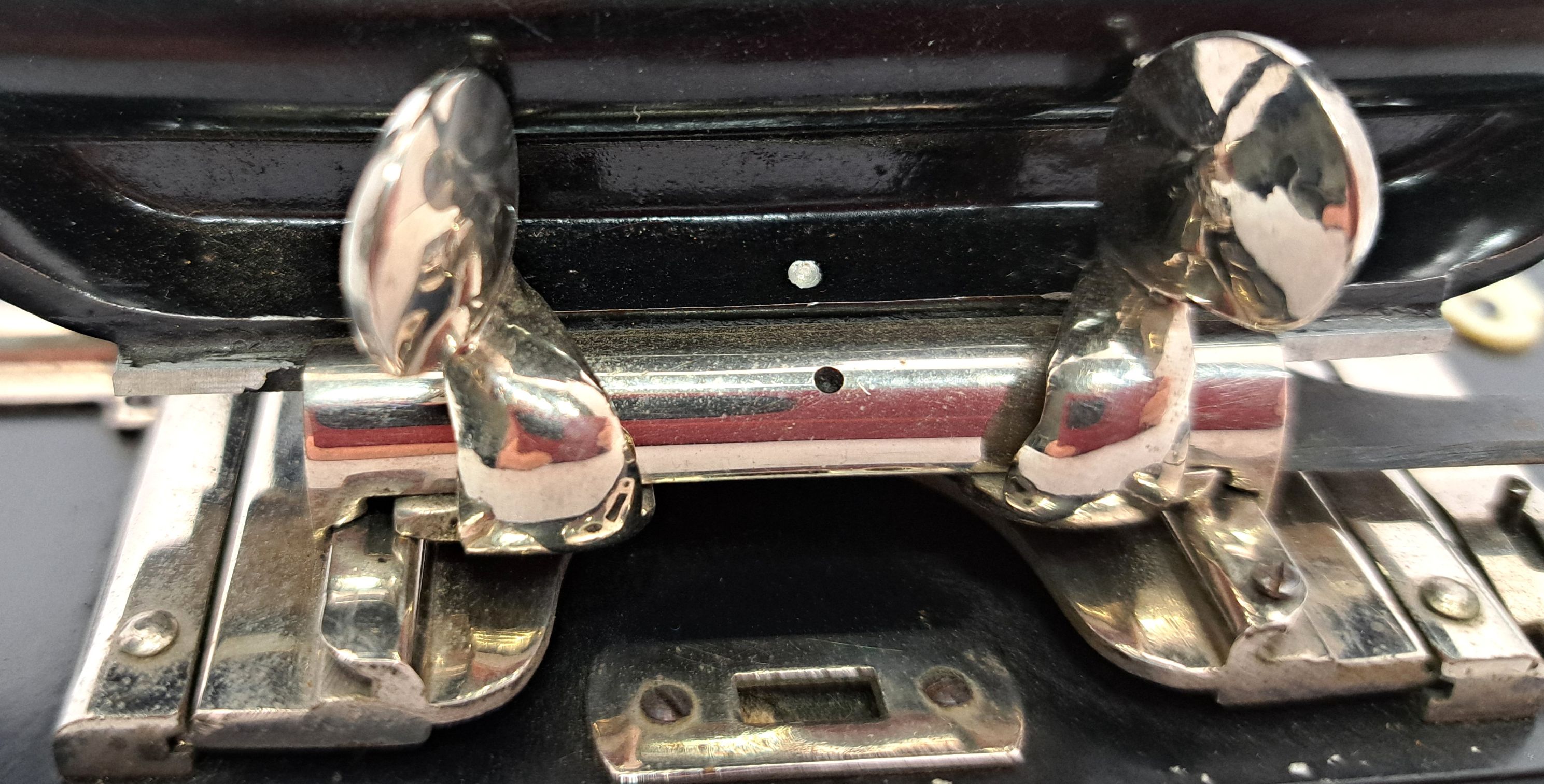 Vielleicht hat jemand solche Handhaben schon einmal gesehen. Sie sind unterhalb des Laufschlittens angebracht, in einem Stück nach oben gebogen zum Tellerchen erweitert und nach außen verschränkt. Die Rückseiten der Tellerchen sind sehr fein symmetrisch geriffelt. Es ist eine super Schmiedearbeit und mit Sorgfalt vernickelt. Man kann keinen Grat entdecken. Bei der Kamera muss es sich um ein höherwertiges Modell handeln, wenn man schon bei den Handhaben diesen Aufwand betreibt