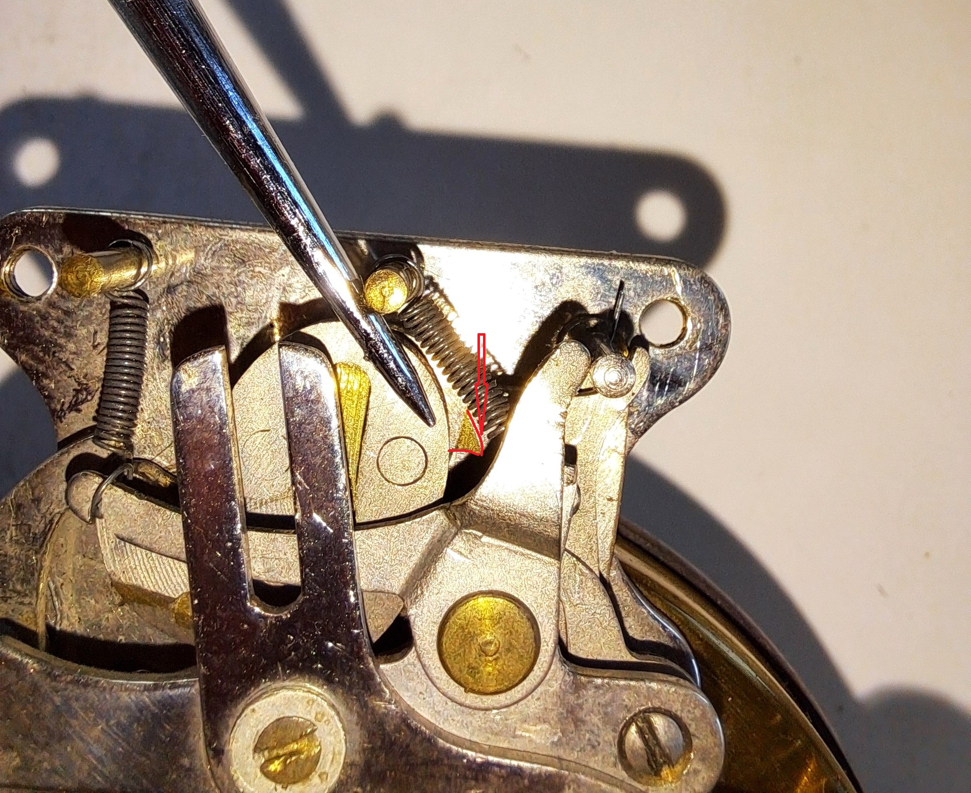 Wenn ich den Verschluss spanne, bewegt sich die kleine Nase nach unten, so als wolle sie irgendwo einhaken. Ich finde aber nicht wo und wie.