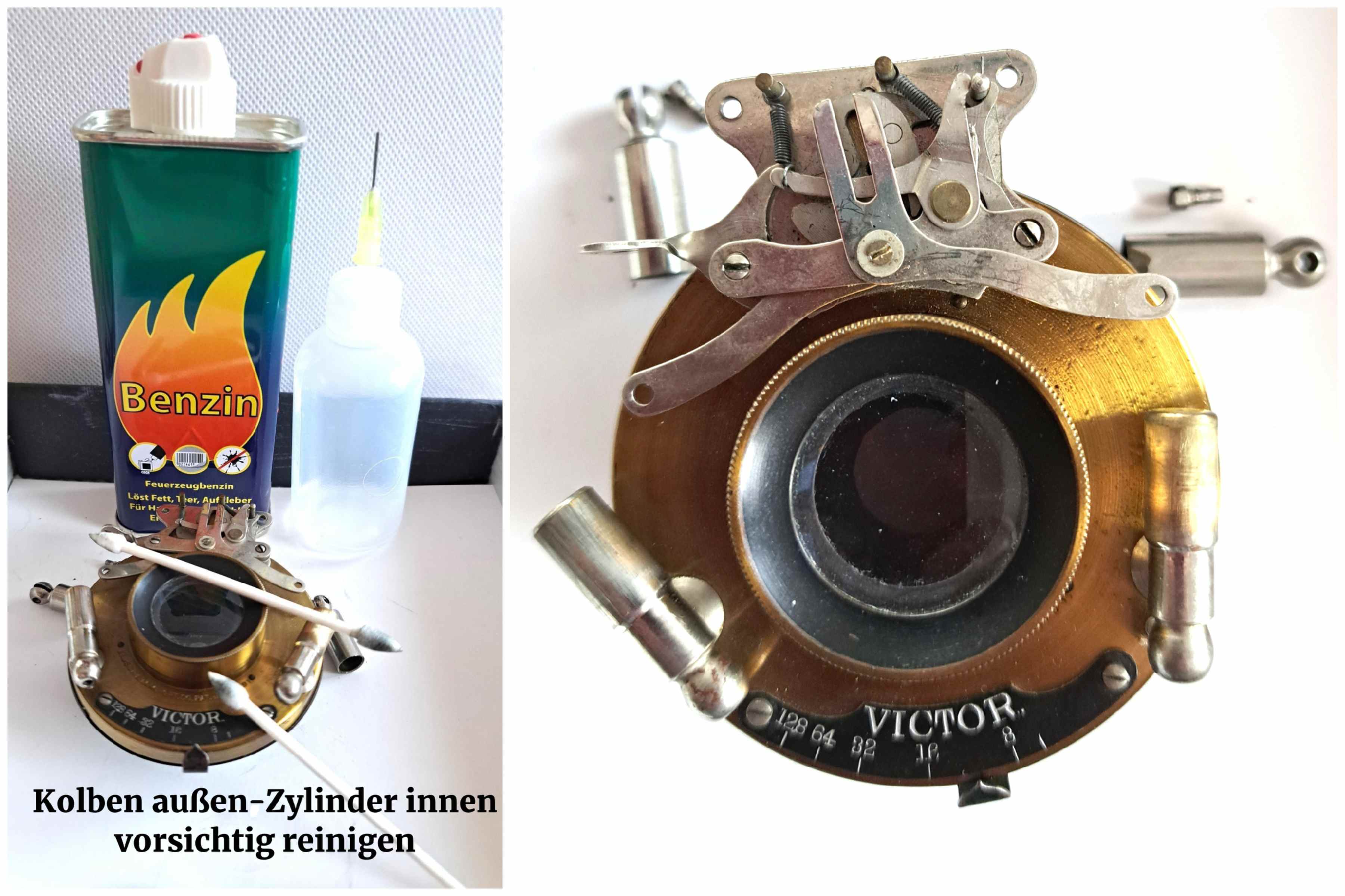 die obere Abdeckung des Victor-Veschlusses ist abgeschraubt. Die beiden Federchen waren noch intakt. Der rechte Zylinder hängt fest. Wie kann ich ihn lösen? Mit Feuerzeugbenzin, mit Alkohol?