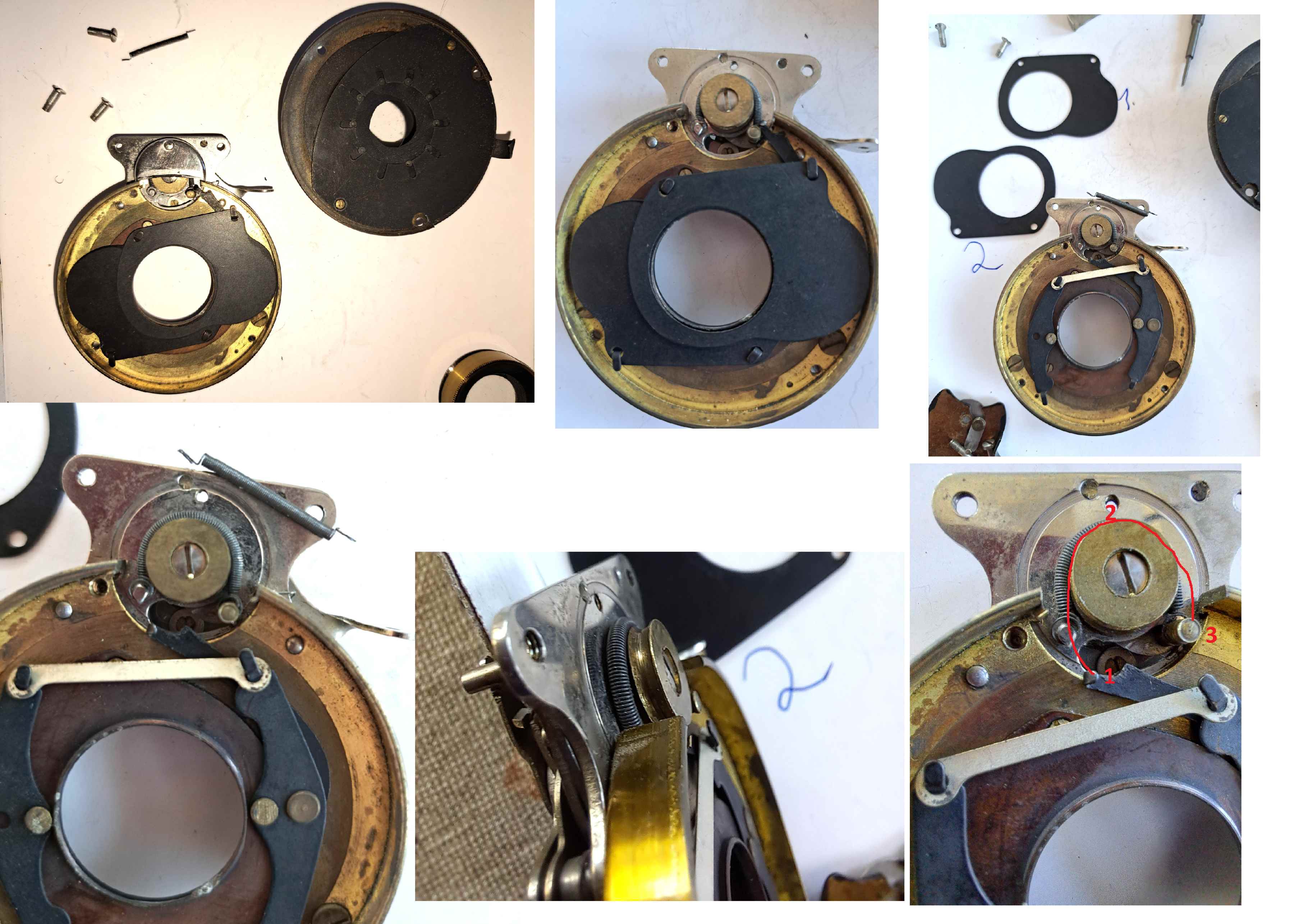 Jetzt die Rückseite des Objektivs entfernen und sofort fand ich eine lose Feder. Wo gehört sie hin? Die kleine halbrunde Abdeckung entfernt und da war schon eine Feder. Ich entdeckte eine zweite Rille in der Führung. Ich habe auch die Stellen gefunden, wo die zusätzliche Feder eingehängt werden muss. Sie bleibt aber nicht da, wo sie sein sollte, sie fliegt mir um die Ohren. Als Zugabe begab sich auch eine kleine Feder vom Verschluss auf Wanderschaft. Das Ganze wurde zur sportlichen Betätigung. Auf allen Vieren auf dem Boden und unter dem Tisch herumkrabbeln. Im Gegensatz zu mir fand unser Hund das ganz witzig und fasste es als Spiel auf. Also Hund aus dem Zimmer und weitersuchen. Ich habe beide gefunden. Anschließend alles ordentlich in den Deckel eines Schuhkartons gepackt und auf dem unteren Boden der Vitrine geparkt. Bis zum nächsten Versuch.