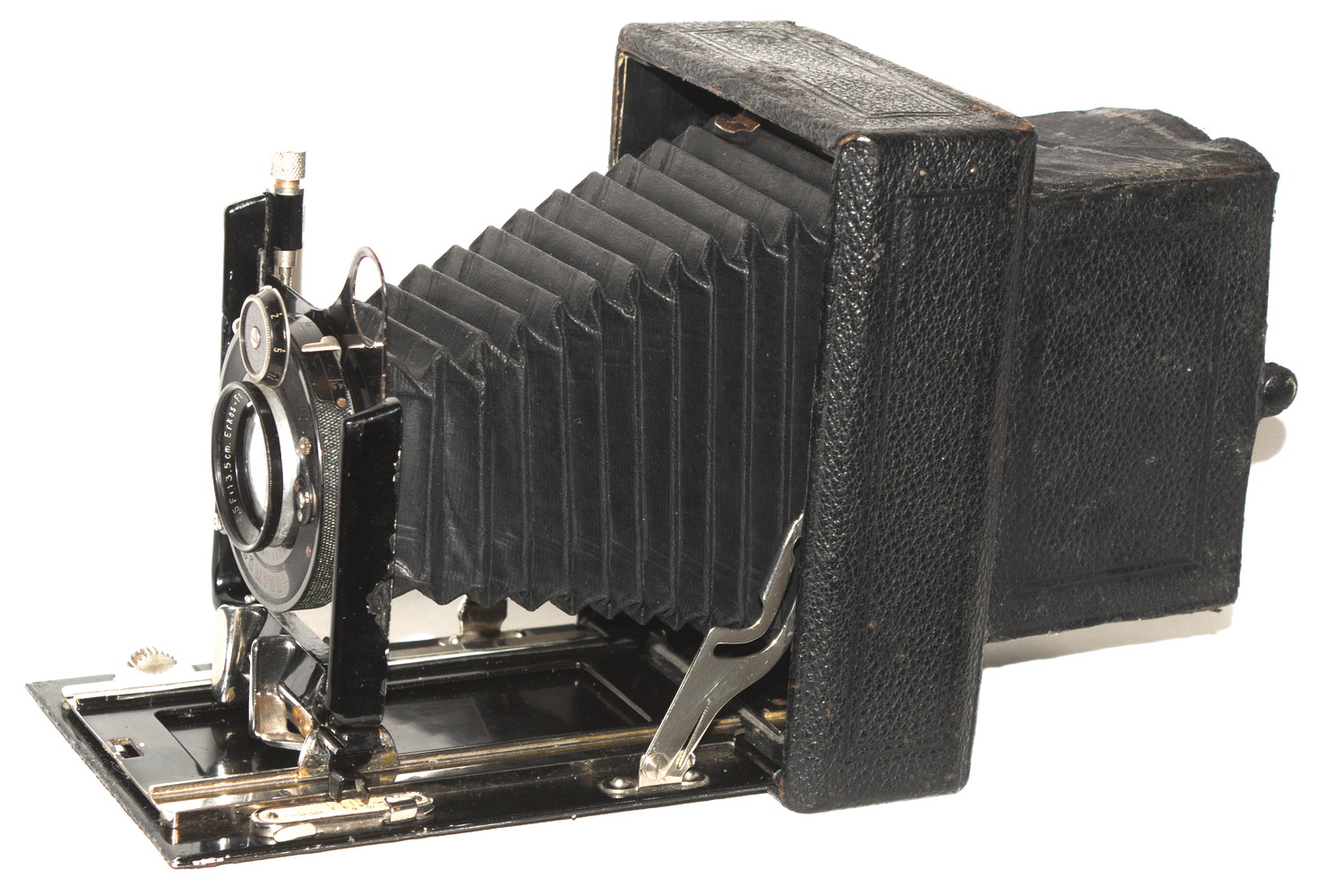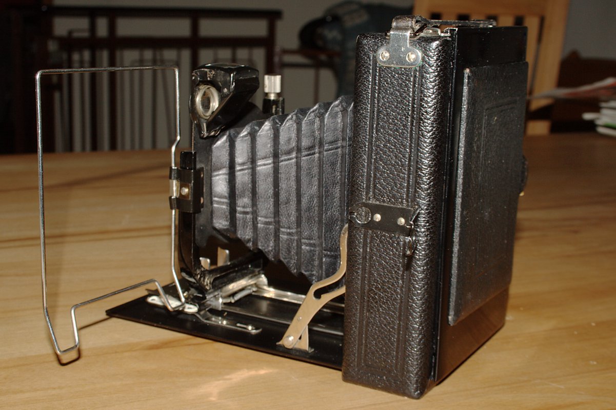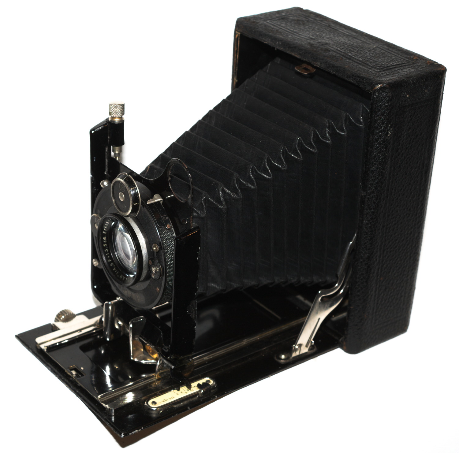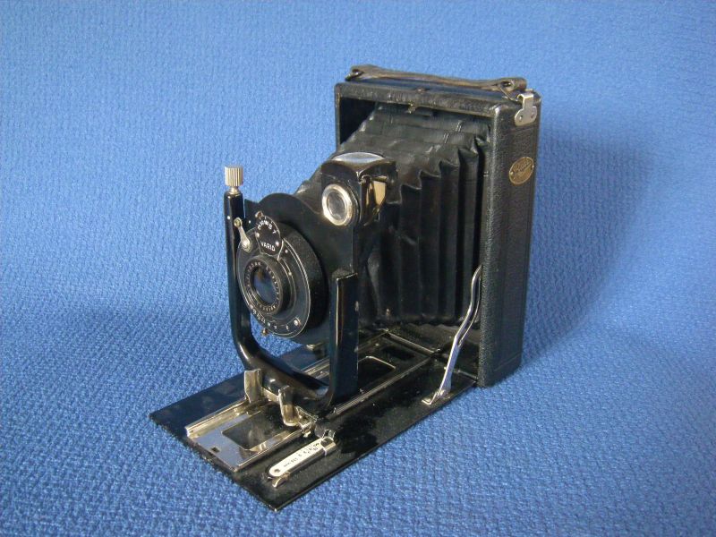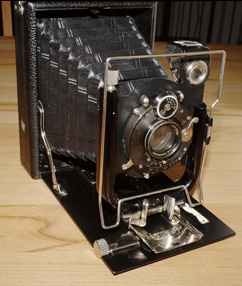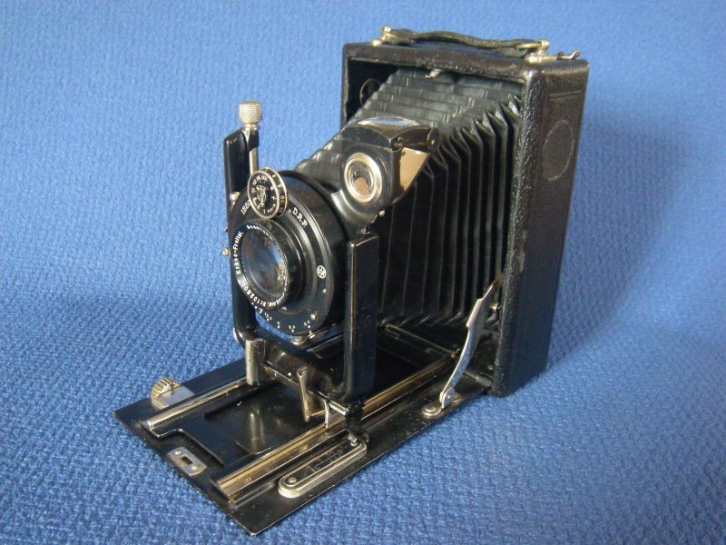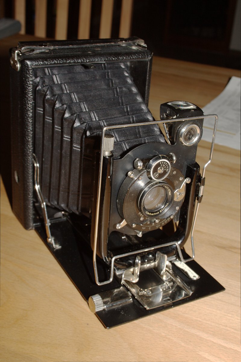 bin eben auf diesen Beitrag gestoßen, ein seltenes "Schätzchen". Natürlich bin ich meine Sammlung durchgegangen. Dabei bin ich auf meine zweite Sammelkamera gestoßen. Die sieht bis auf eine deutlich bessere Ausstattung gleich aus. Meine hat ein versteckt numeriertes frühes Eurynar 1:6.8/135 (ca. 1911, noch Doppel-Gauß, nicht Dialyt - noch nicht separabel, sieht fast wie neu aus) in einem sehr frühen Compound (7 o'clock!) und einen Rahmensucher. Das scheint nicht ganz zu einer Kamera zu passen, die erst nach 1920 gebaut sein kann. Leider fehlt ihr der Original-Lichtschacht, der bei Deiner dabei ist.