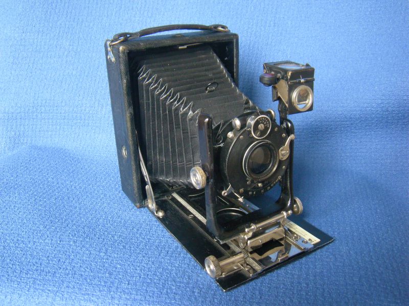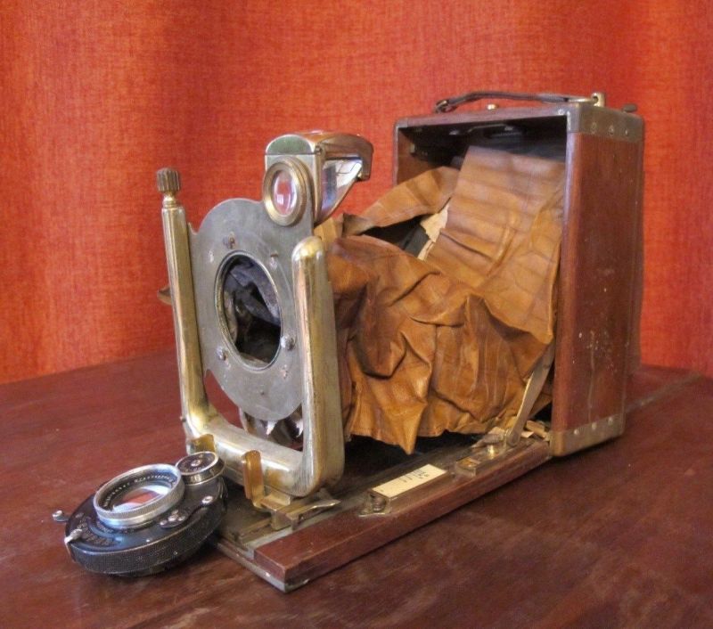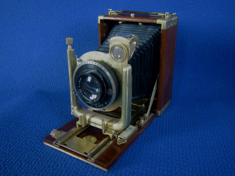 Und hier eine Laufbodenkamera von einem mir (noch) unbekannten Hersteller im Format 9x12, im Hoch-und Querformat ansetzbares Rückteil, senkbarer Laufboden, dreifacher Auszug, Goerz Dagor Serie III 6,8/150mm, Compound: