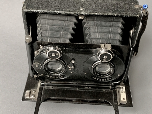 In den Stereo-Teilen der Kataloge von Auer, Abring und Cornwall habe ich die Kamera nicht gefunden; für die übrigen Kataloge müsste man den Hersteller kennen... In der zeitgenössischen Stereo-Spezialliteratur werden nur Apparate großer Hersteller in exemplarischer Auswahl vorgestellt. In der an sich ganz guten Übersicht auf stereoskopie.com fehlt das Modell auch.