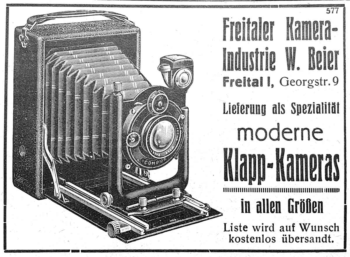 dieses Rätsel kann ich lösen: Es handelt sich bei der eingangs gezeigten Kamera um eine frühe Lotte (Lotte I) von Woldemar Beier. Zum Nachweis kann die folgende Werbeanzeige von 1926 dienen, die dieses Modell (allerdings mit den anderen Beier-Spreizen) zeigt: