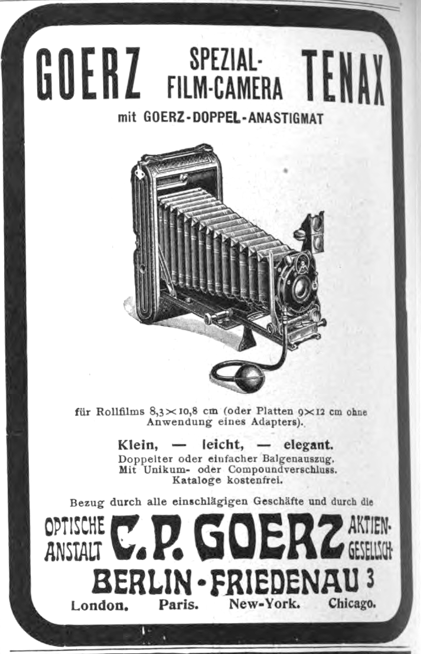 Ich kann das im Prinzip alles unterschreiben. Für die Goerz-Tenax haben wir als terminus post quem immerhin die Anzeige von 1908, man beachte auch die Schrift, in der der Firmenname in der Anzeige erscheint. Da besteht eine gewisse Ähnlichkeit, auch wenn nicht alle Buchstaben verglichen werden können: