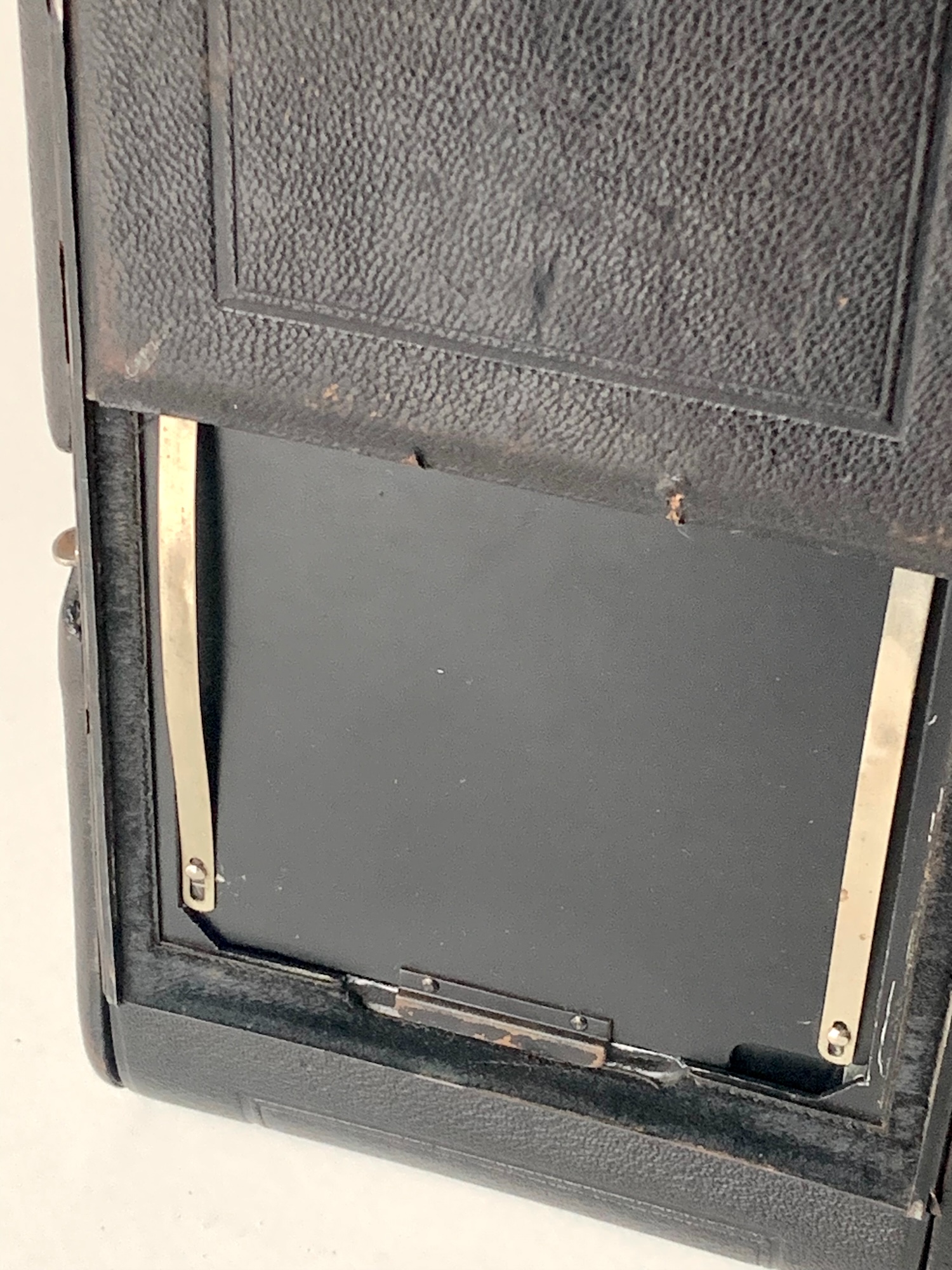 Getauscht habe ich auch die Entfernungsskala, die beim zweiten Exemplar in einem besseren Zustand war. Am Rückteil habe ich den (ohnehin nicht passenden) Mattscheibeneinsatz entfernt und dafür Filmandruckplatte und Abdeckung montiert; die Kamera wäre nun für Rollfilmbetrieb einsatzbereit. Die Andruckplatte ist federnd gelagert; die Abdeckung wirkt auf die seitlichen Federbleche, die die Abdeckpaltte dann gegen den Film drücken.