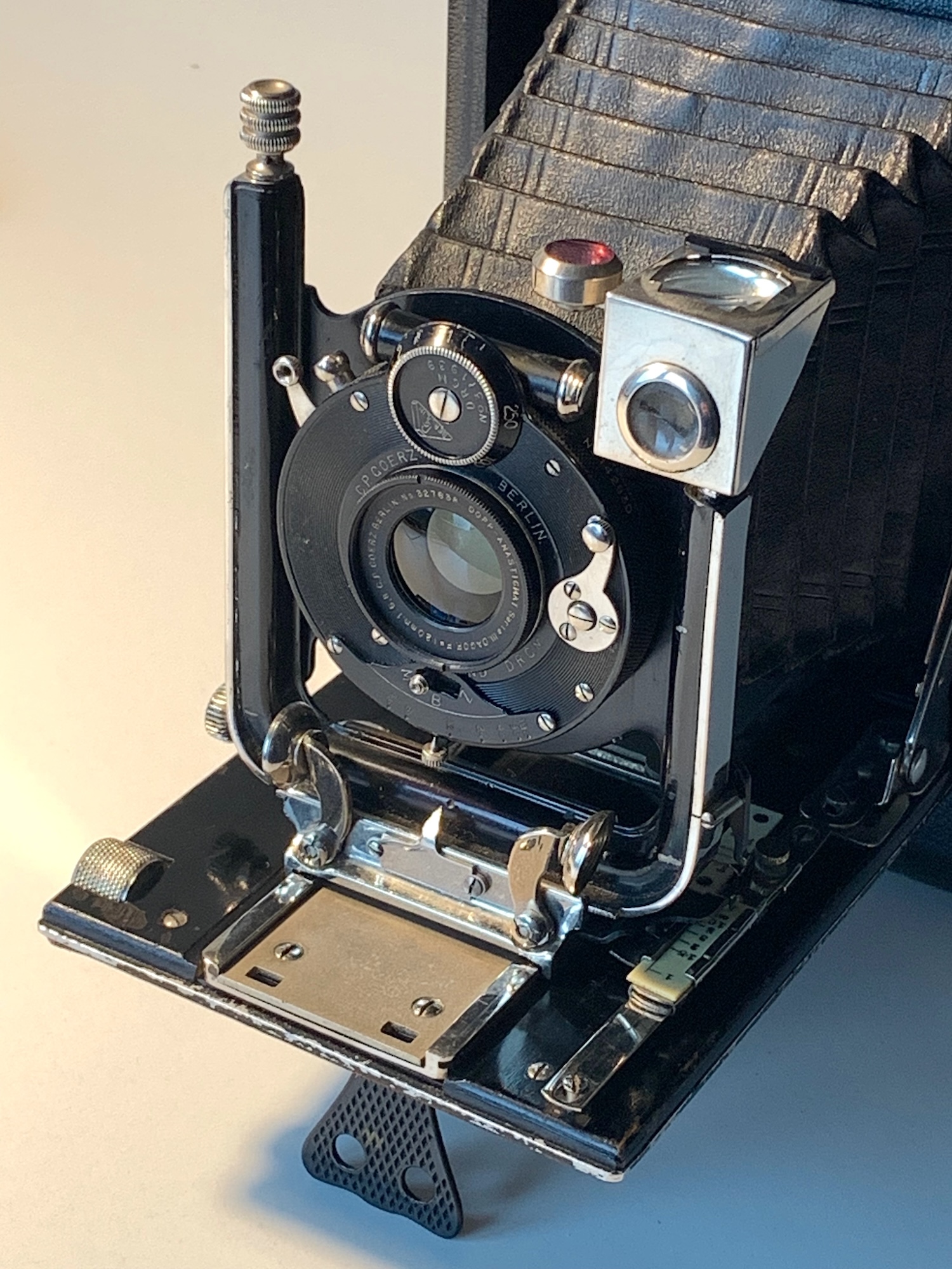 Allerdings scheinen mir Standarte und Laufboden doch etwas anders gestaltet zu sein, sofern man das erkennen kann. Und auf der Kamera findet sich an keiner Stelle ein Hinweis auf Goerz (das Obj. ausgenommen).