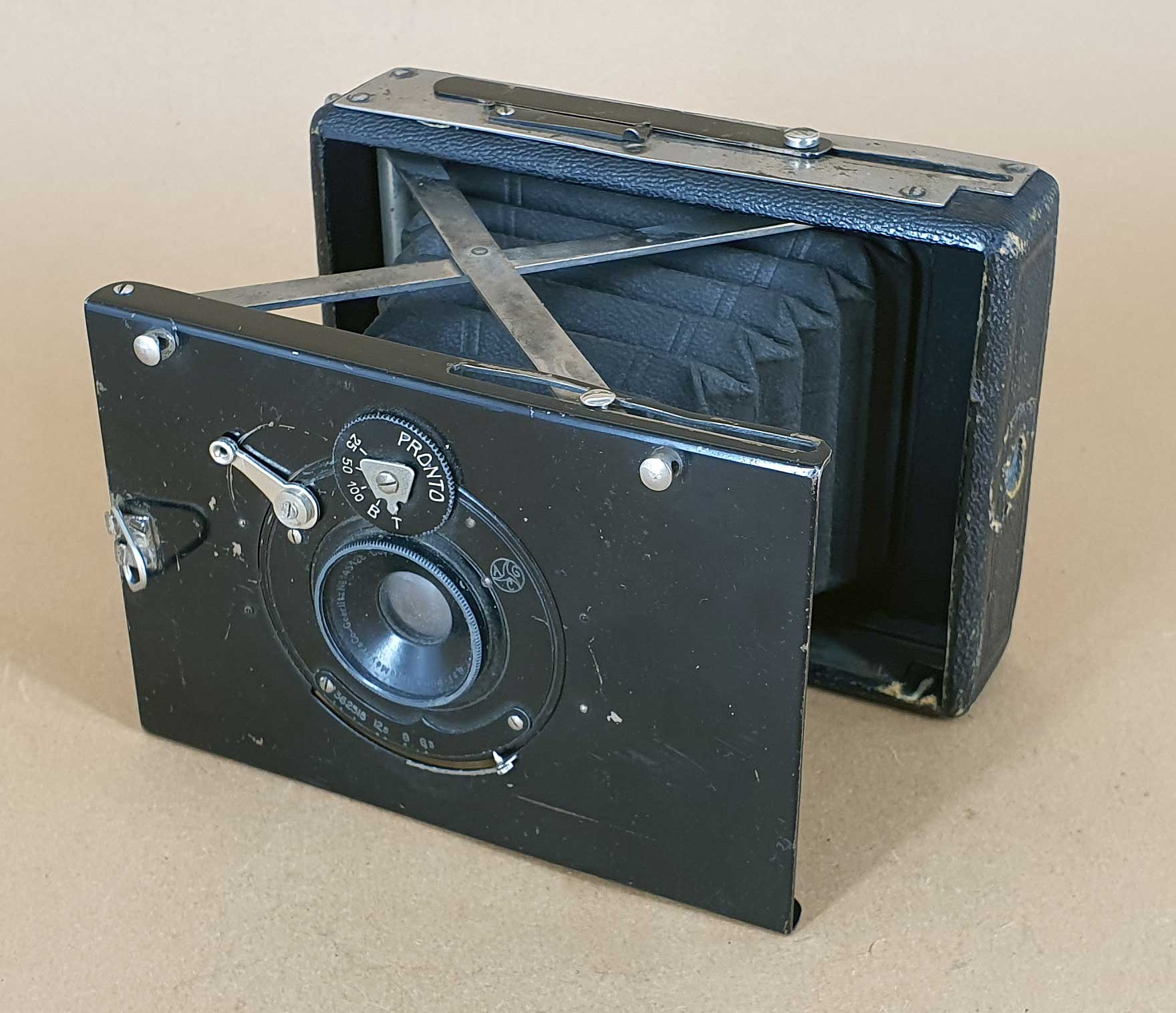 in einem Kölner Schaufenster habe ich ein weiteres Exemplar dieser Kamera entdeckt – ausgestattet mit Meyer Citoplast 6,3/90 in Pronto, also wie Axels Exemplar. Die Meyer-Seriennummer verweist auf ein Baujahr im Zeitraum 1918–1920. Der Sucherrahmen ist vorhanden, dafür fehlt der klappbare Griffhebel. Nähere Angaben gab es nicht, und das Rückteil war nicht zu sehen. Vielleicht nehme ich die Kamera gelegentlich mal in Augenschein.