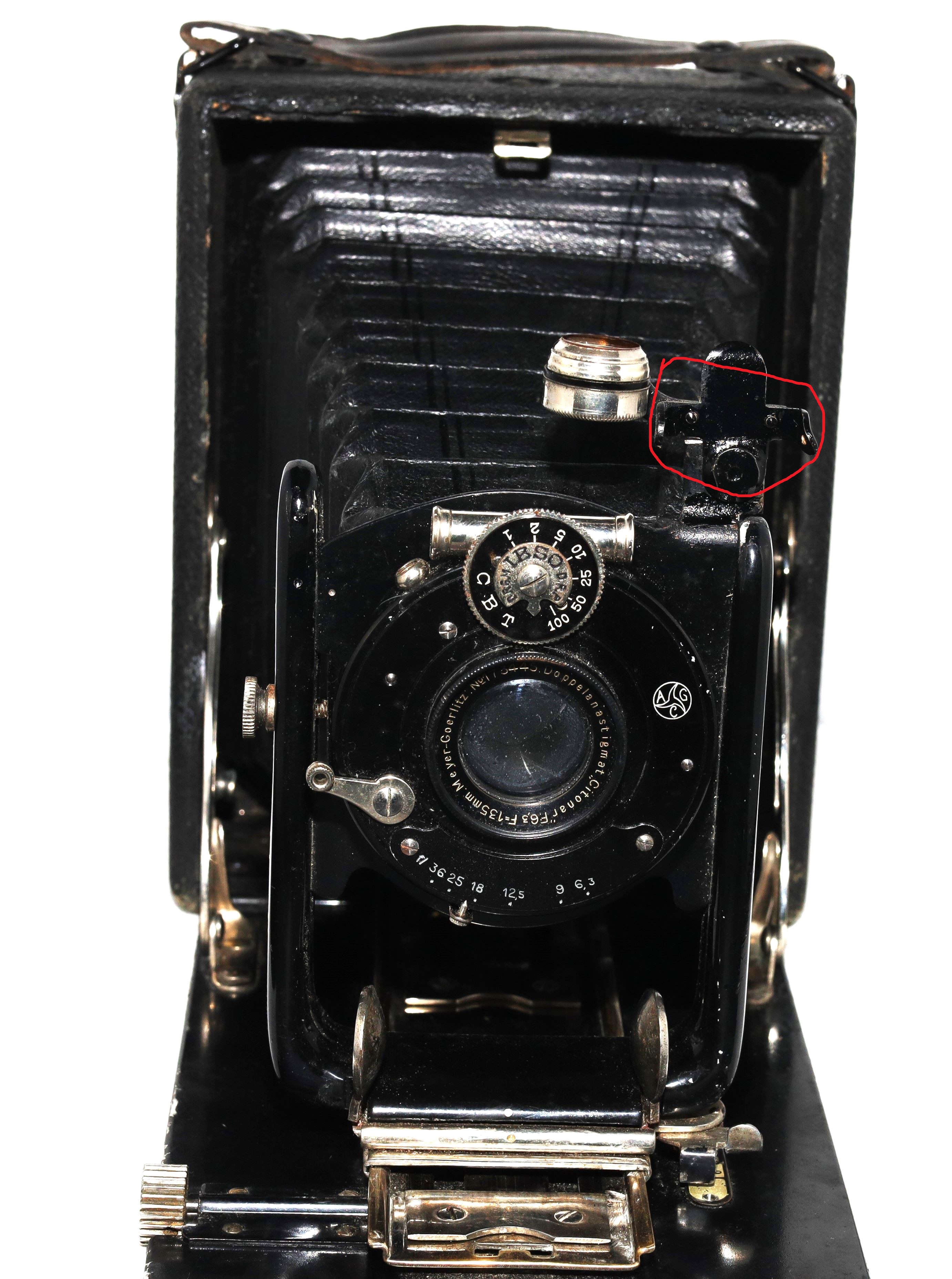 Also bei meiner Kamera handelt es sich um die Contessa Nr.215 mit IBSO-Verschluss aus dem Jahr 1921. Der Brillantspiegel war wohl beim Vorbesitzer kaputt gegangen und hing nur als Bruchstück fest. Die Libelle war ok. Ich habe dieses Bruchstück entfernt, lackiert und die Libelle stehen lassen. Deshalb diese seltsame Ansicht.