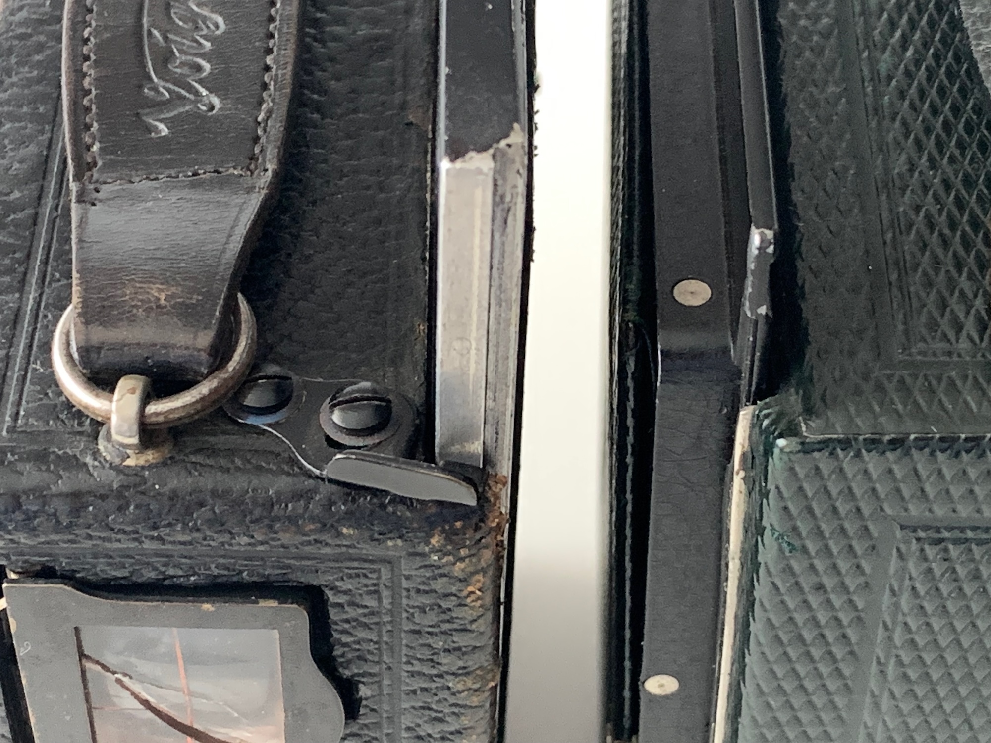 Bei vielen Kameras des frühen 20. Jahrhunderts greift die Kassette in einen vergleichsweise breiten (knapp 4 mm) Schlitz, wie man auf der linken Seite am Beispiel einer frühen Bergheil (1. Modell) sieht.
