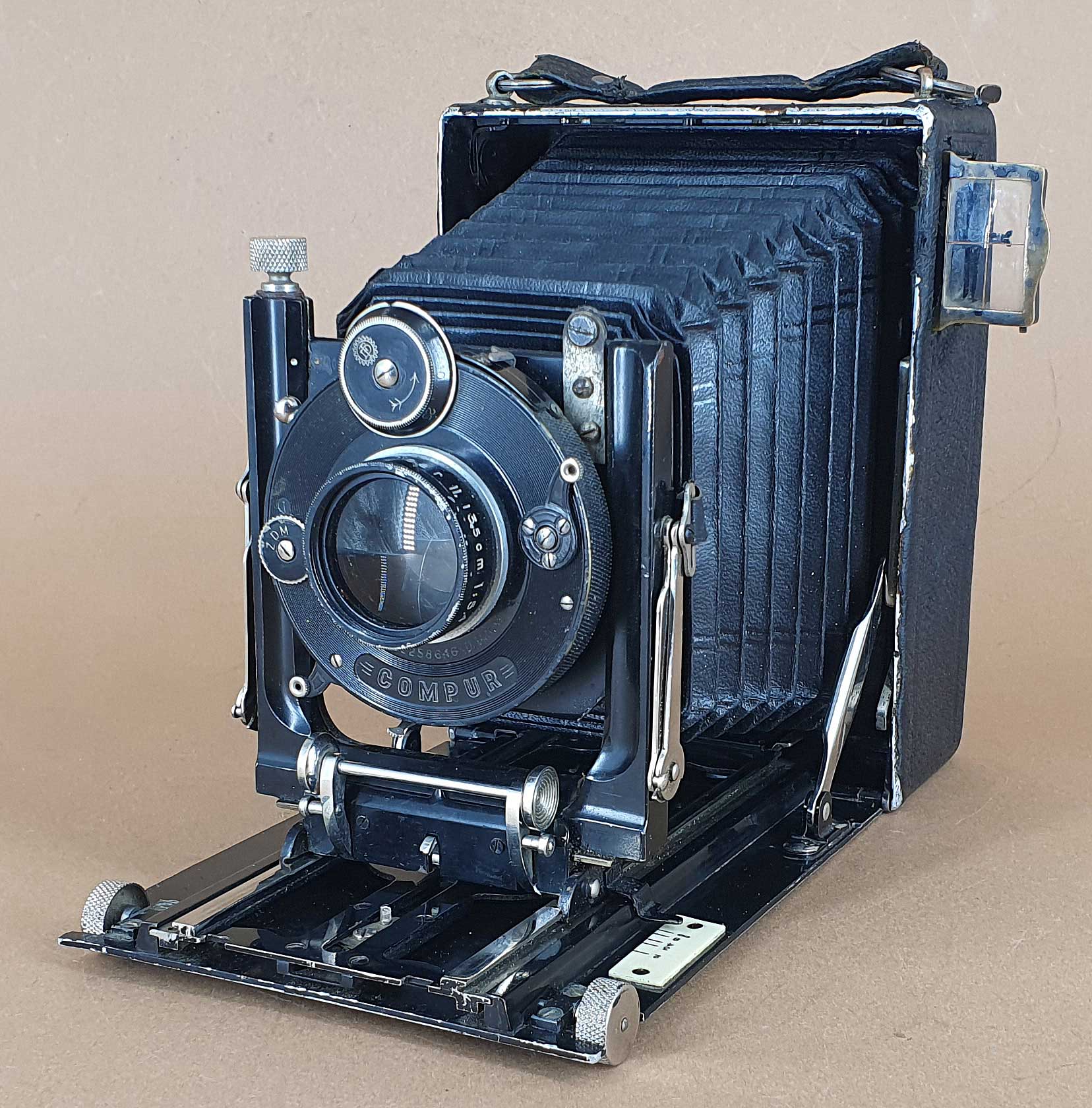 interessant, das scheint alles sehr uneinheitlich gehandhabt worden zu sein! Nach Prochnow sollen frühe Kameras keinen Rahmen um die Entfernungsskala haben, andererseits sollen die autom. Balgenstrecker Kennzeichen späterer Exemplare sein. Dass Dein Exemplar zu den späteren gehört, zeigt auch der Compur – vorher waren Compound-Verschlüsse verbaut. Prochnos listet auch nur Compound (sowie Koilos und Ibso).