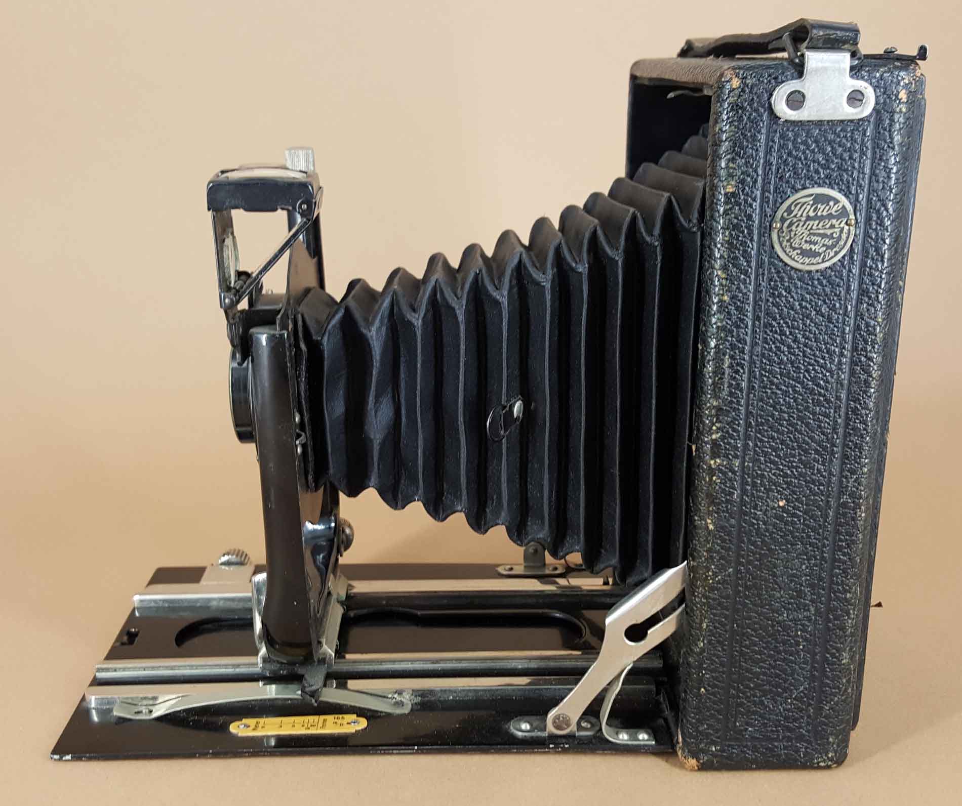 Dann formuliere ich es mal korrekter: Kameras mit diesen Griffbefestigungen und diesen Spreizen finden sich 1909 in der Preisliste von Arnold-Marienberg. Es ist unklar, ob Arnold oder Merkel oder eine andere Firma diese Kameras fertigte. Karl Arnold verkaufte nach dem 1. Weltkrieg nachweislich Kameras von Ferdinand Merkel unter eigenem Namen.