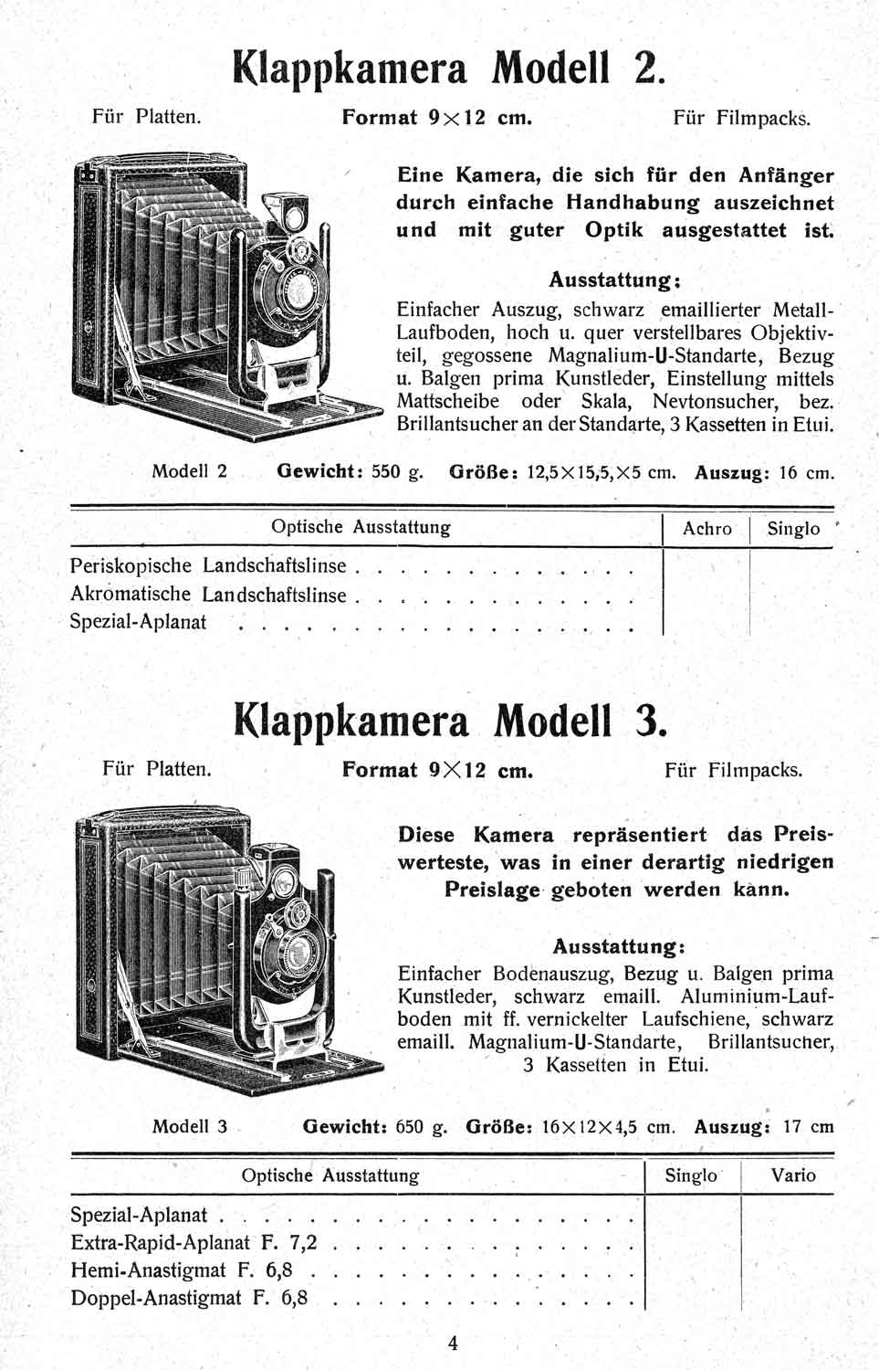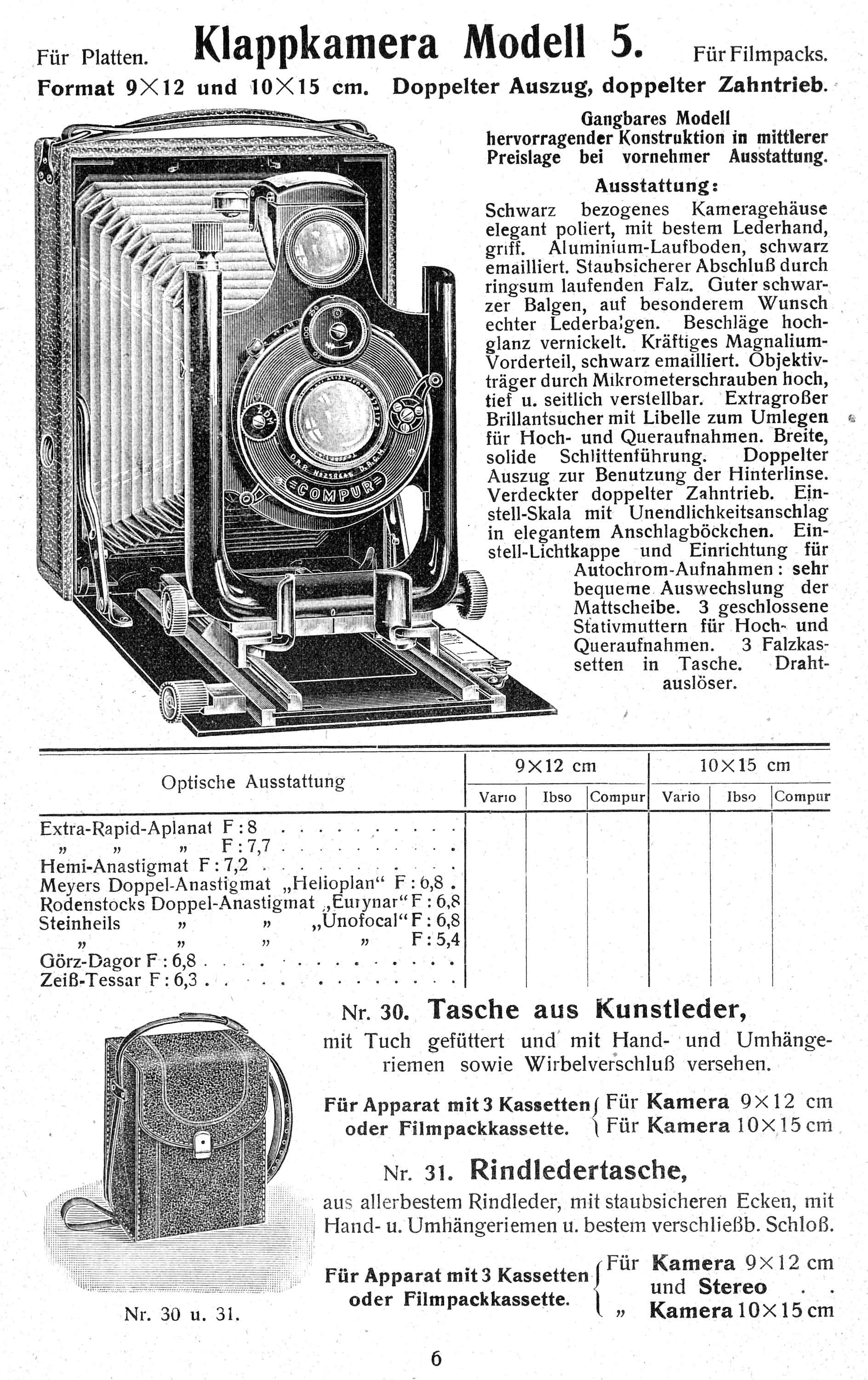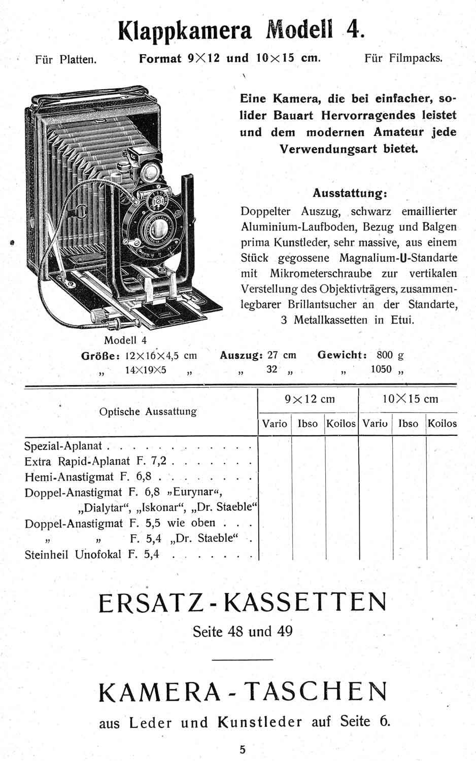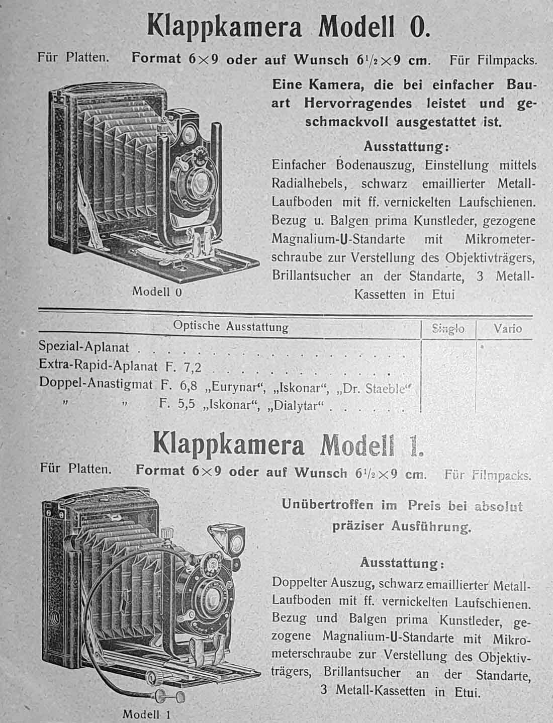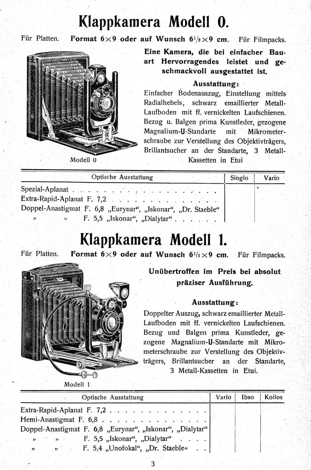 das kann ich gern tun. Allerdings habe nicht den 1909er Arnold-Katalog, sondern einen jüngeren, aus dem auch der obige Auszug stammt. Dieser Katalog ist nicht datiert, kann aber auf Grundlage eines darin enthaltenen Gebrauchsmusterschutzes („Proft’s Stativ in der Westentasche“) ca. 1921/22 eingeordnet werden. Es sind auch nur sechs Klappkameras enthalten (neben Merkel und ‚merkelartig‘ ist noch eine Orion dabei). Bemerkenswert ist sicherlich, dass Arnold noch den Koilos anbot.
