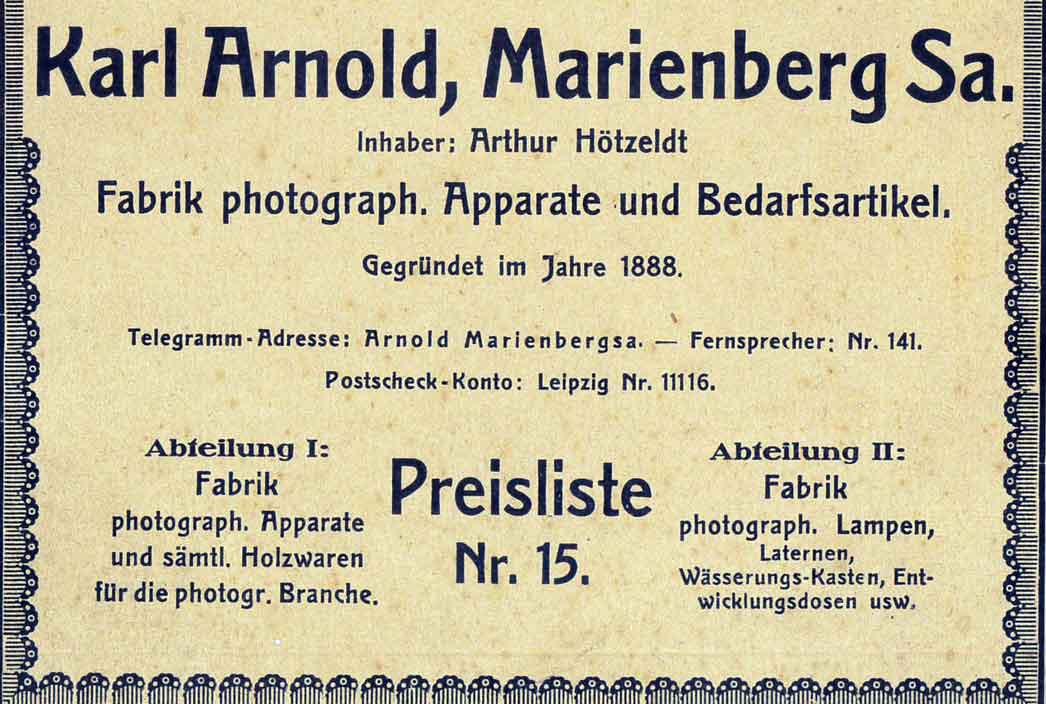 Ich kann deiner Argumentation folgen. Da gibt es irgendein Verbindungsglied... Die 1888 gegründete Firma Karl Arnold nannte sich erst (nach Thiele) ab 1909 "Fabrik photographischer Apparate und Bedarfsartikel" (das Jahr der Arnold-Preisliste). Da wollte man gleich auftrumpfen und das Ganze Programm an Geräten und Zubehör liefern können. Das war war wohl aus eigener Fertigung nicht alles machbar...also hat man zugekauft, z.B. bei Merkel, um die Lücken zu schliessen. Immerhin gab es wohl alleine an Klappkameras die Modelle 1 bis 14! Also möglich wäre es schon, dass das Modell 1 von Arnold selbst hergestellt wurde. Wir suchen also Beweise.....
