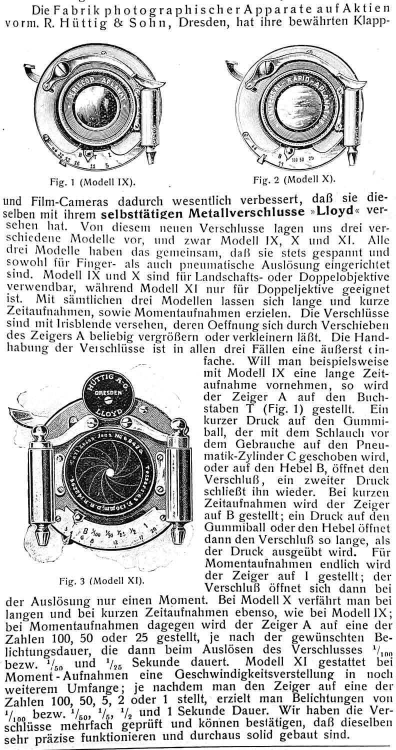 Die Bezeichnung Lloyd wurde von Hüttig ab 1904 auch (wie Jan schon schrieb) für ‚firmeneigene‘ Zentral-Verschlüsse verwendet. Ich nehme an, dass diese Verschlüsse von Hüttig selbst hergestellt wurden. Es finden sich für Hüttig 1905 auch Gebrauchsmustereintragung bzgl. dieser Llyod-Zentralverschlüsse.