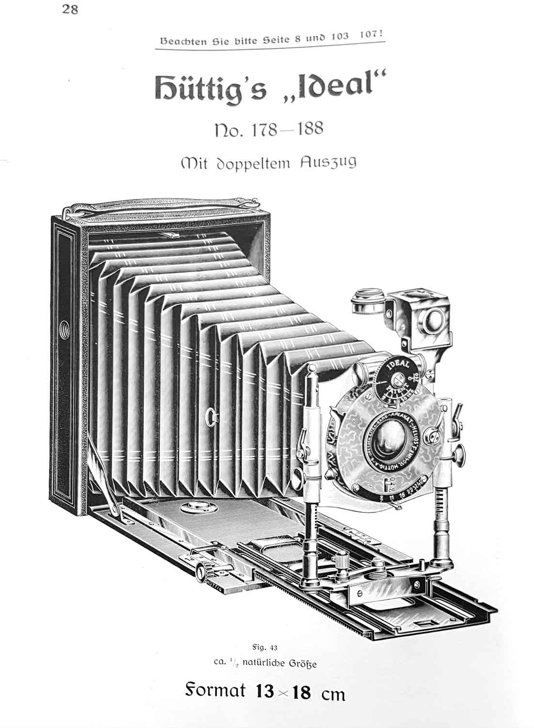 Was das oben gezeigte Modell betrifft, so habe ich dieses in exakt dieser Bauform nicht gefunden. Ich würde anhand der Merkmale trotzdem mal eine Einordnung versuchen: Abgesehen vom Sucher, den Spreizen und der Griffbefestigung entspricht die Kamera einer Hüttig Ideal 13x18 aus dem Katalog von 1906.