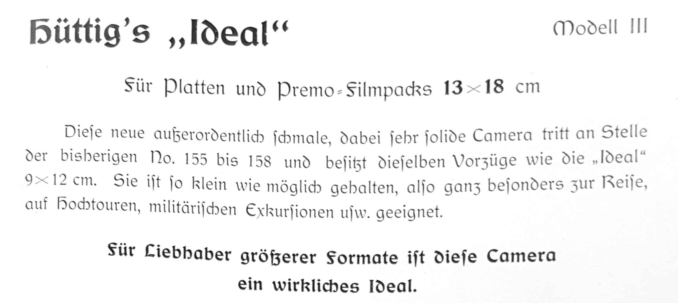 Die Griffbefestigung und auch die Spreizen findet man bei Hüttig gelegentlich bei anderen früheren Modellen. Interessanter ist aber der Sucher. Dieser ausklappende Sucher findet sich nur im Katalog und in der Hüttig-Werbung von 1905 und zwar bei den ersten Ideal Modellen. In früheren oder späteren Katalogen findet man diesen Sucher nicht. Im Jahr 1905 brachte Hüttig (wie oben erwähnt) im April die Ideal auf den Markt und zwar zunächst nur zwei Modelle im Format 9x12 (einfacher Auszug und Doppelter Auszug). Zu Beginn des Jahres 1906 folgten dann weitere Ideal-Modelle im kleineren und größeren Format, wie die oben gezeigte Ideal 13x18. In der Beschreibung der Ideal 13x18 findet sich noch der Hinweis, dass sie die bisherige 13x18 Kamera No. 155 – 158 ersetzt.