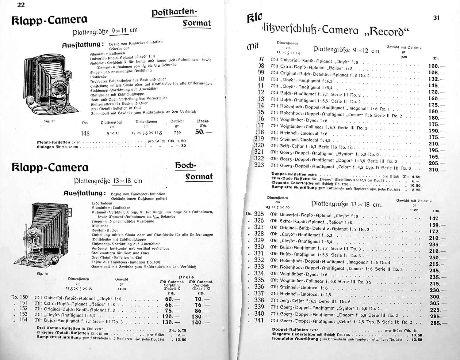 Denn die entsprechenden Seiten wurden bei diesem Katalog herausgerissen. Man kann deshalb nur mutmaßen, dass sich hinter den No. 155-158 die oben gezeigte Kamera von Ingrid verbirgt, die bis zur Einführung der Ideal 13x18 unter der Bezeichnung „Klapp-Kamera“ auch noch zu Beginn des Jahres 1906 vertrieben wurde. Für diese Vermutung spricht in jedem Fall die Tatsache, dass die Kamera von Ingrid keine „Ideal“-Prägung aufweist.