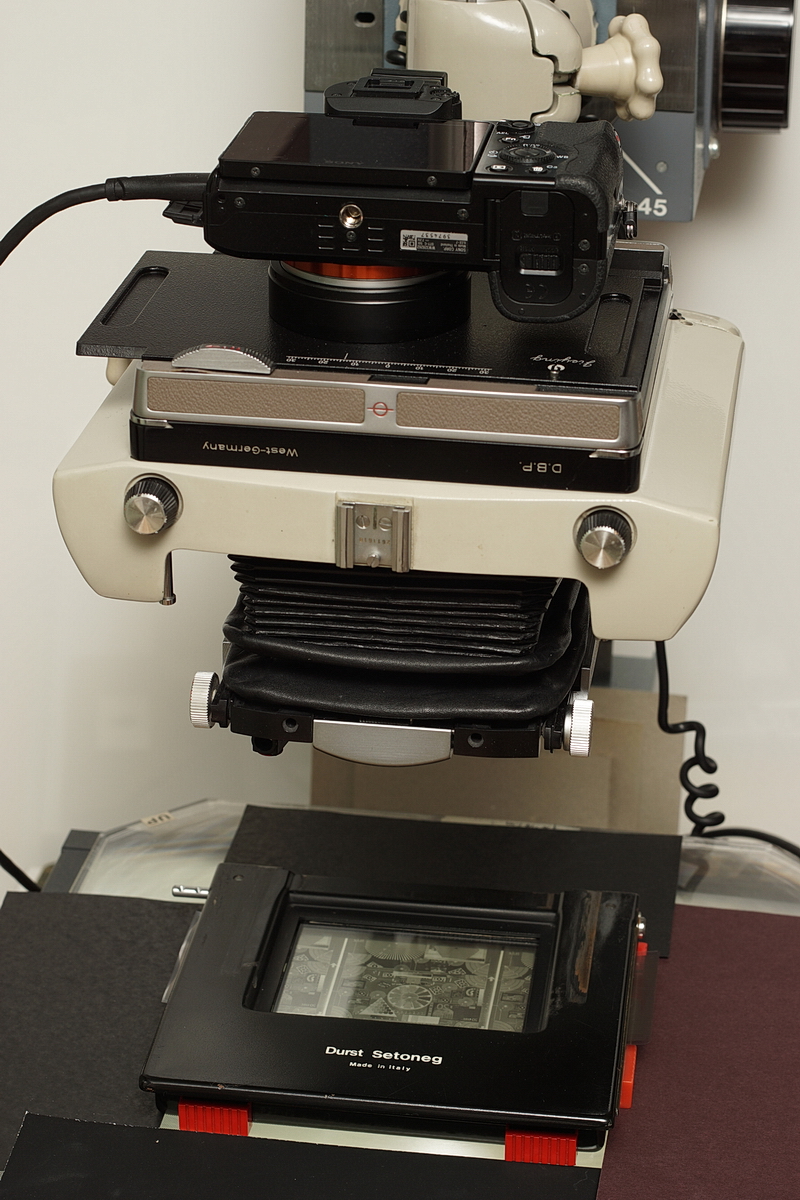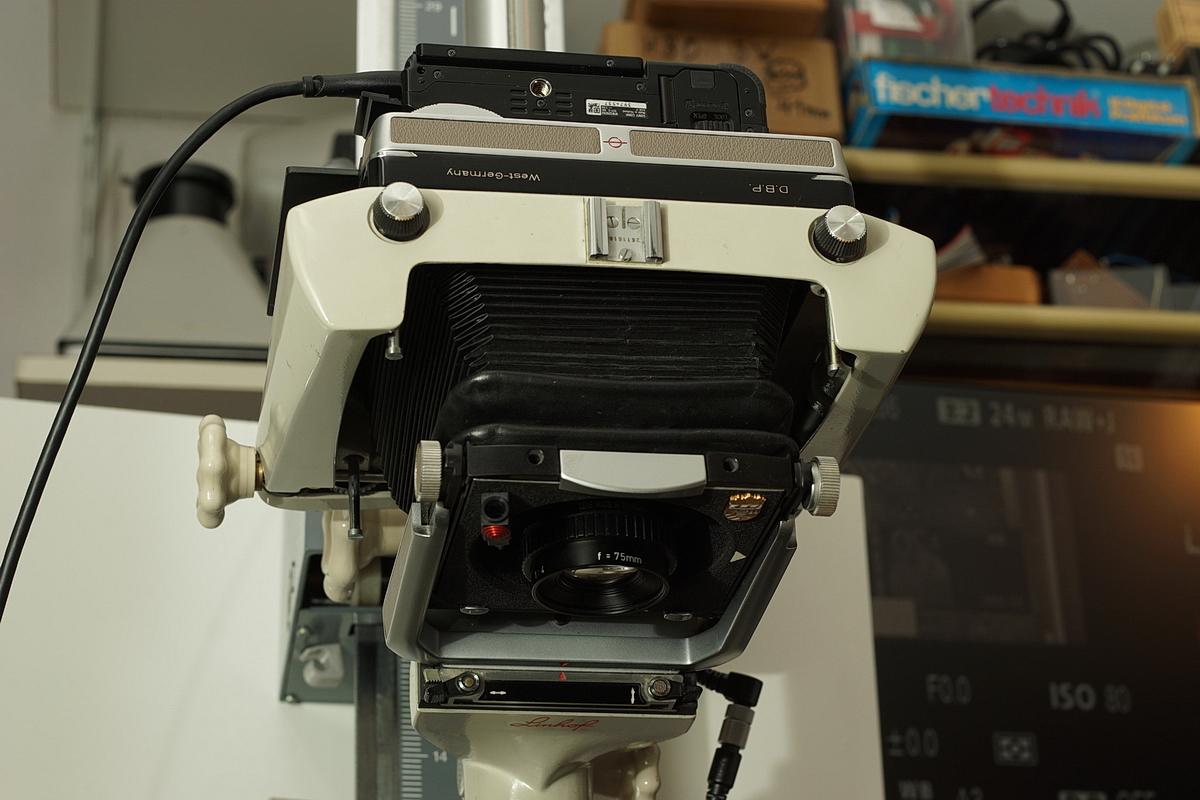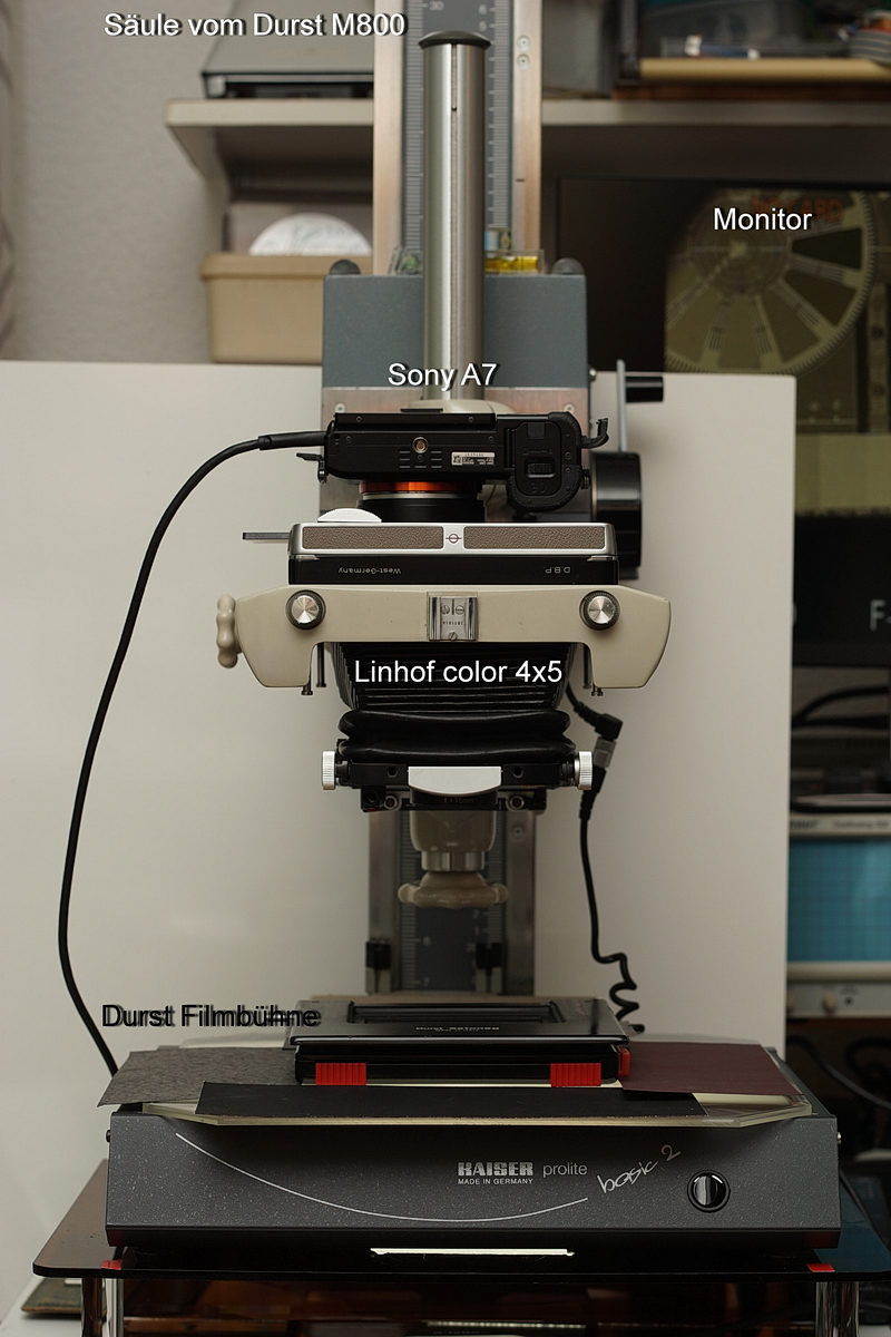 Zwischen der A7 und der Linhof Color 4x5 befindet sich ein Adapter, mit dem die A7 um +/- 25mm in x- oder in y-Richtung verschoben werden kann. So kann das komplette 6x6 Bild mit dem Sensor bis zum ABM 1,5:1 abgetastet werden.