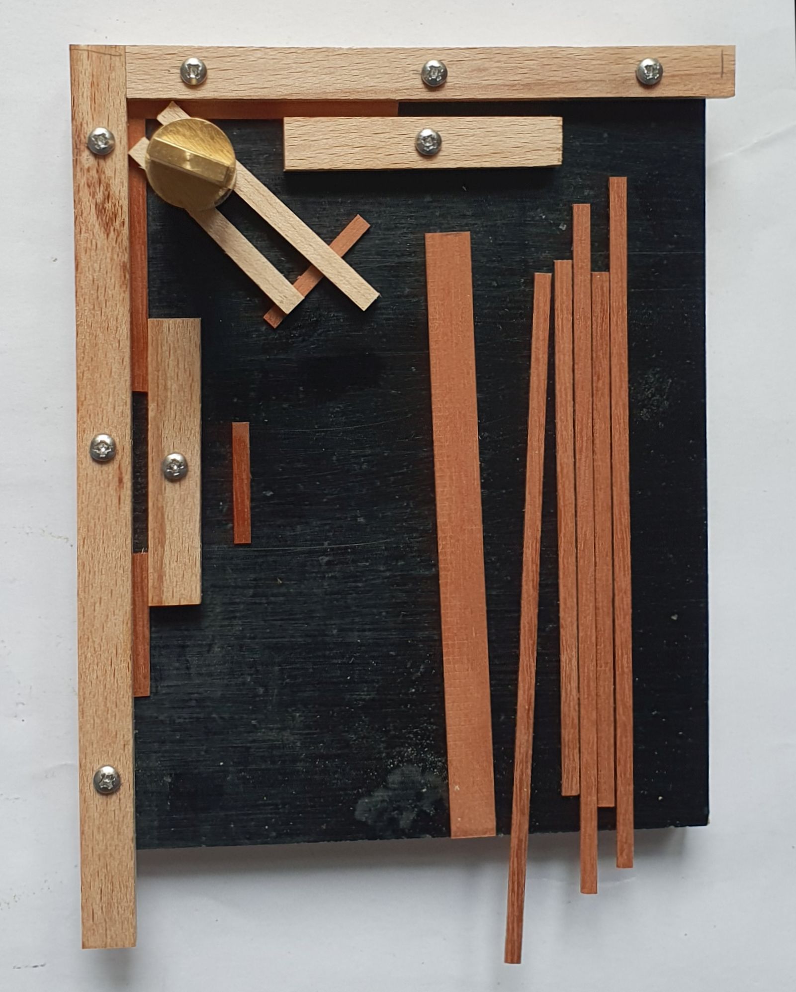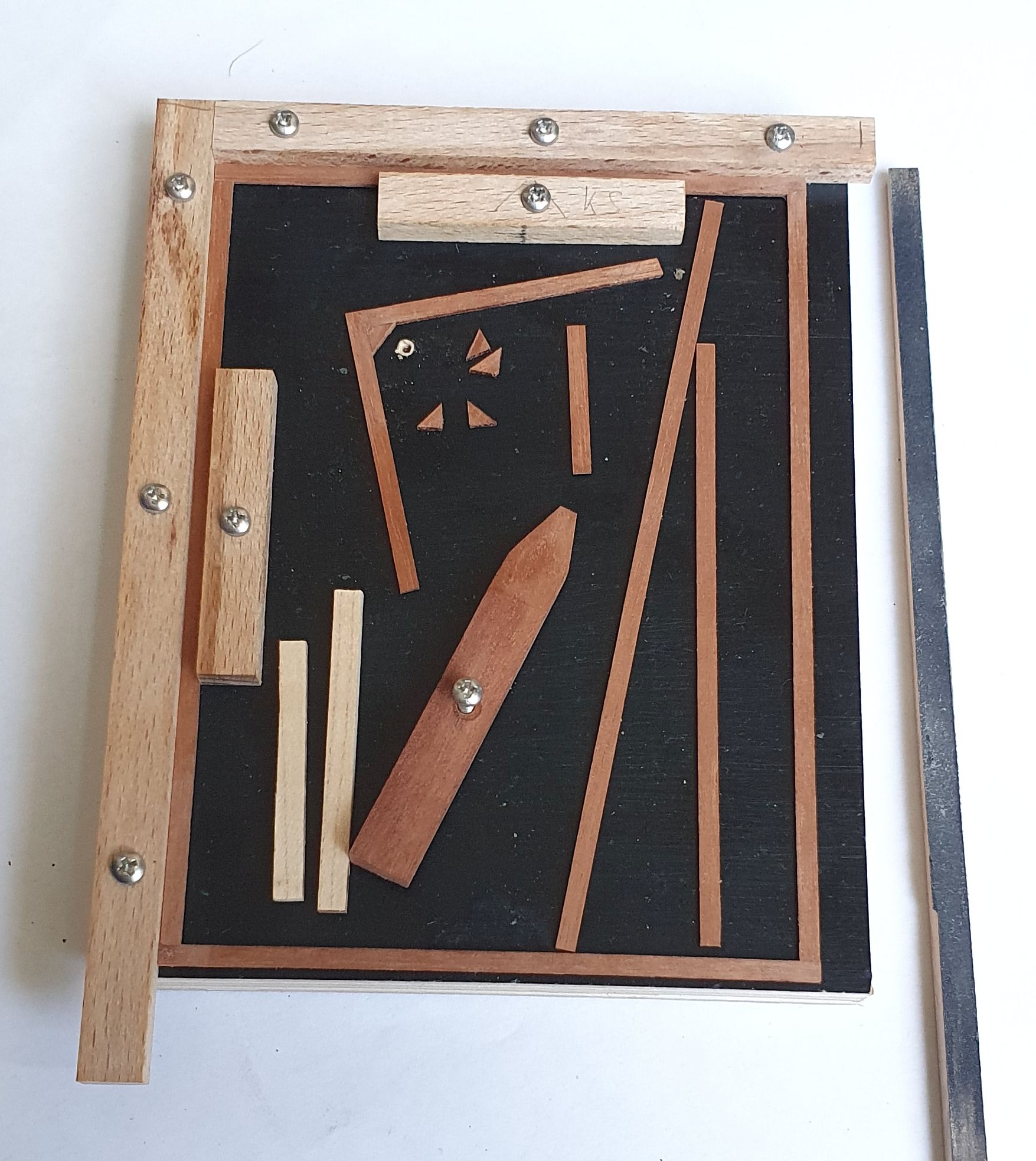 Am kritischsten war der Einlegerahmen mit der 0,95 mm Dicke und 2,65 mm Breite. Das lässt sich weder gut zuschneiden noch verleimen. Das Material (sehr feinporiges Mahagoni) hab ich an einem Miniatur Dickenhobel auf 0,95 mm abgerichtet und beim Zuschneiden hat eine Proxxon Tischkreissäge mit einem sehr fein verzahnten Sägeplatt (für Furniere) geholfen. Die Säge muste ich vorher noch mal etwas nachjustiert. Für das Positionieren beim Leimen habe ich mir eine kleine Einspannvorrichtung angefertigt. Und wieder erwarten ließ sich auch das gut machen. Ich konnte sogar die geplanten Eckverstärkungen (Diagonalstücke) weglassen, die ich an einer Probeecke ausprobierte – wäre mit Eckaussteifung überdimensioniert. Das waren auf jeden Fall mal die kleinsten Holzarbeiten die ich in meinem Leben ausgeführt habe.