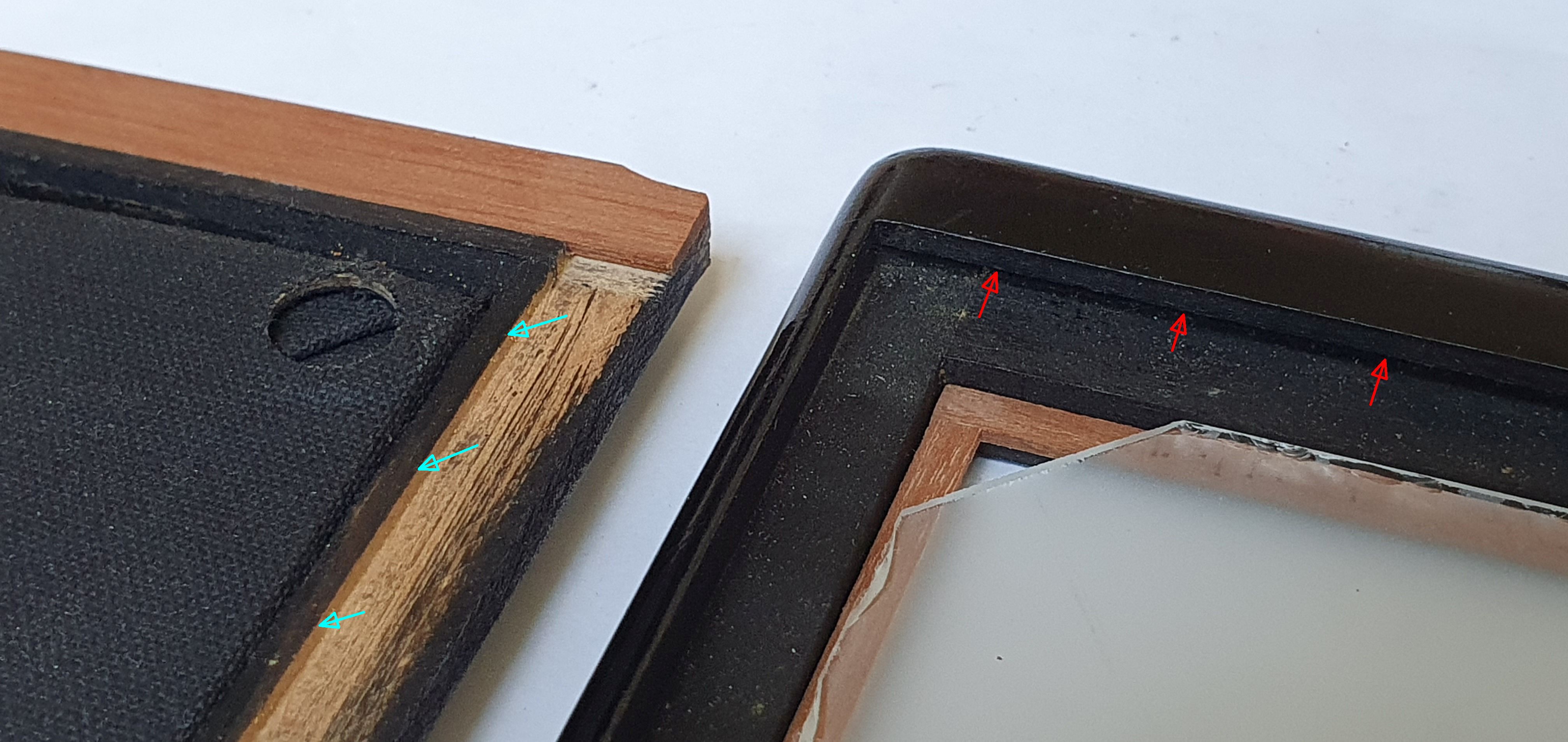 Ich habe erstmal die neuen Planfilmeinlagen favorisiert und ein paar Probefotos gemacht. Den Versatz hab ich mit dem Rückstellen der Standarte nach dem Scharfstellen ausgeglichen. Ganz zufrieden war ich - was die Schärfe angeht - aber noch nicht. Nachdem ich die Einschübe mit der Matscheibe abgeglichen habe betrug der tatsächliche Versatz ca. 0,95 mm. Ich hab mir noch mal den Mattscheibenrahmen angesehen und der ließ sich ganz überraschend einfach demontieren, indem man aus dem oberen Abschattungsrahmen einseitig zwei Schrauben entfernte. Auf der anderen Seite war die Abschattung mit einem kleinem Holzfalz (siehe rote Pfeile auf dem Bild) in den unteren Rahmen eingeklinkt.