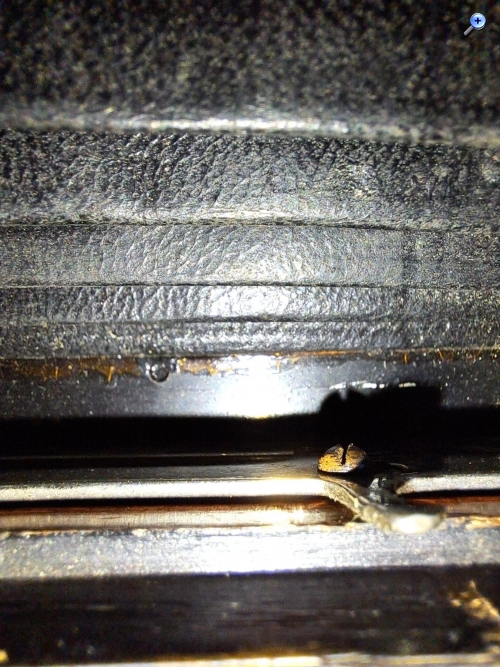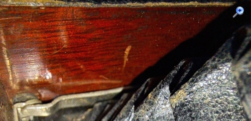 Ergänzung: Das Holz rot zu beizen bei schwarzem Balgen macht eigentlich keinen Sinn. Der Balgen sieht ziemlich neu aus. Klebstoffreste - im Inneren um den Balgen - deuten auf nachträgliches Befestigen hin. Es kann also sein - meine Vermutung - dass der ursprüngliche Balgen rot war.