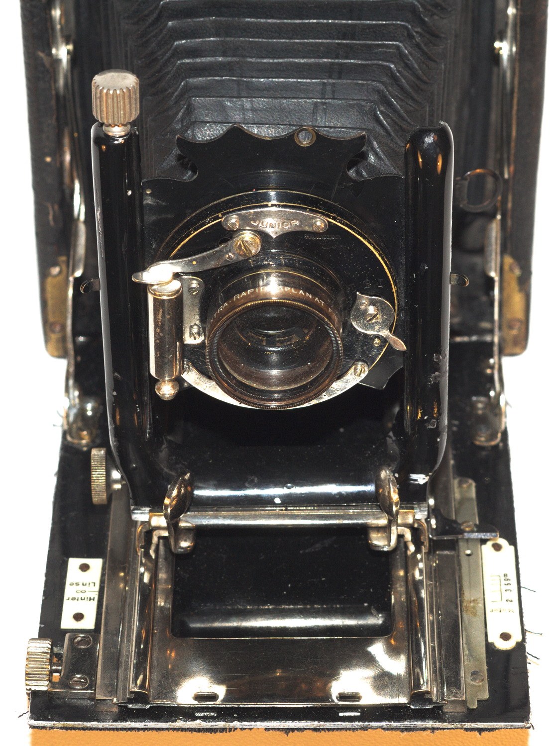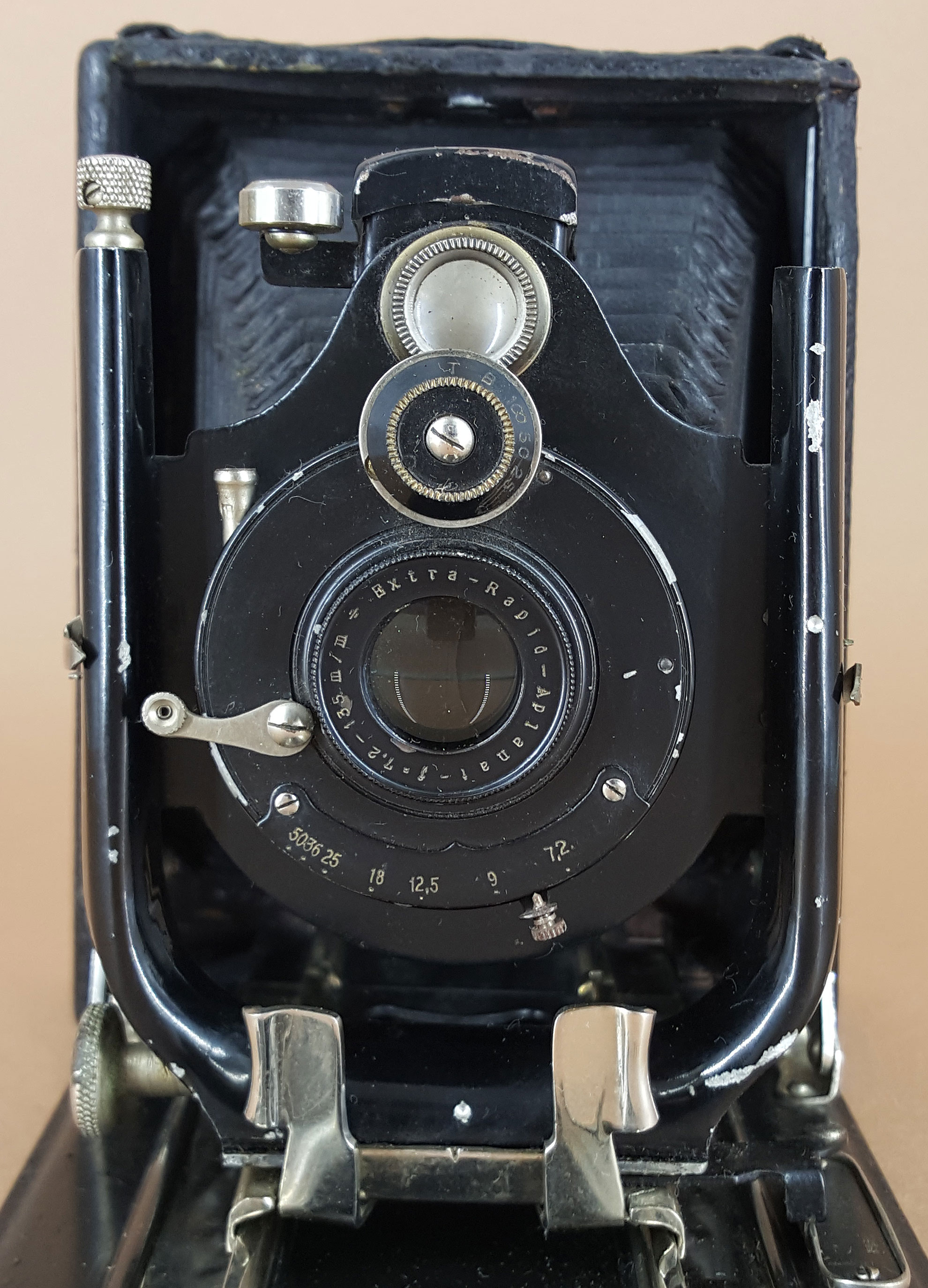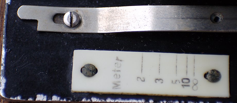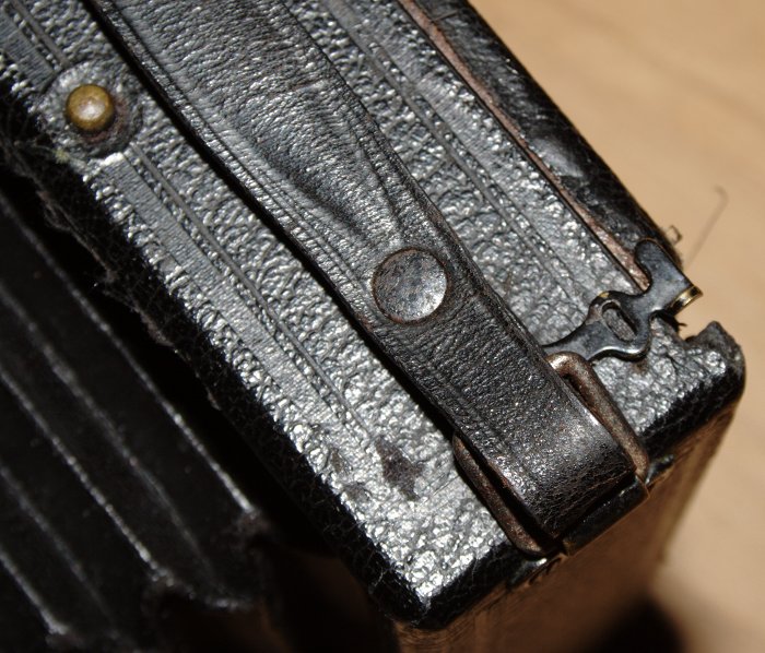 Hier zwei ungewöhnlich läbberige Kameras vermutlich desselben bisher unbekannten Herstellers, beide nicht im Originalzustand. Eine davon - Zweifachauszug, Millionfalz - mit denselben Spreizenfedern wie bei vielen, aber bei weitem nicht allen Weltas. Sie sehen allerdings recht verquetscht aus - ich bin froh, daß sie beim notdürftigen Zurechtbiegen nicht zerbrochen sind. Als innere Abdeckung eines Stativanschlusses hat ein früher Bastler einen Deutschen Reichspfennig aus der Zeit von 1904-1916 verarbeitet. Beim Kauf als Torso fehlten Verschluß, Objektiv und Lichtschacht. Kaufgrund war die andere, einfachere Kamera, meine erste Sammlerkamera (deren Preis ca. € 6.50, Zustand entsprechend). Allerdings wird die Vermutung 'gleicher Hersteller' ausschließlich durch das gleiche Design des Standartenblechs und gleiche Unendlich-Anschläge gestützt, ansonsten sind alle anderen Details anders, und nur die metallenen Griffteile teilweise - nur auf der Oberseite - jedoch signifikant ähnlich. Eine weitere Kamera mit dem gleichen Standartenblech habe ich vor Jahren in der Bucht gesichtet.