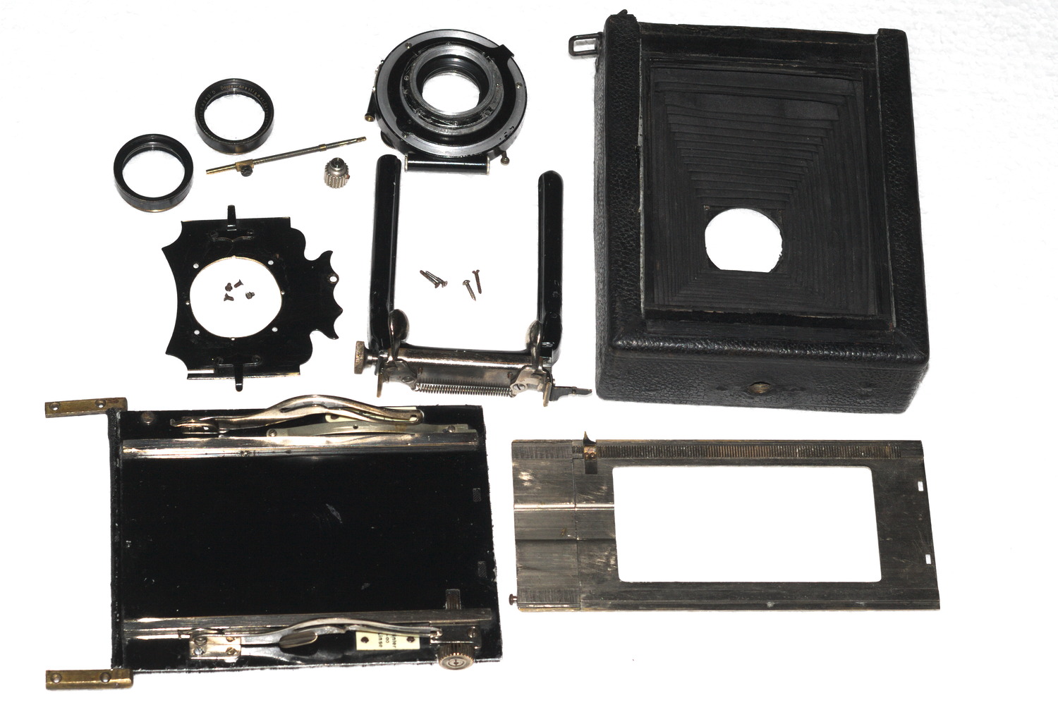 Alle Einzelteile (zusätzlich: Objektiv und Verschluß, sie gehörten ursprünglich nicht dazu)
