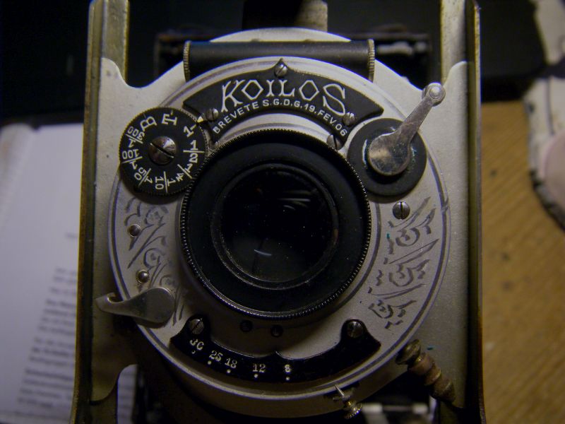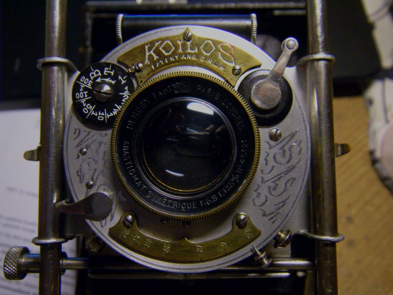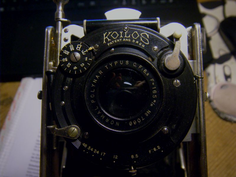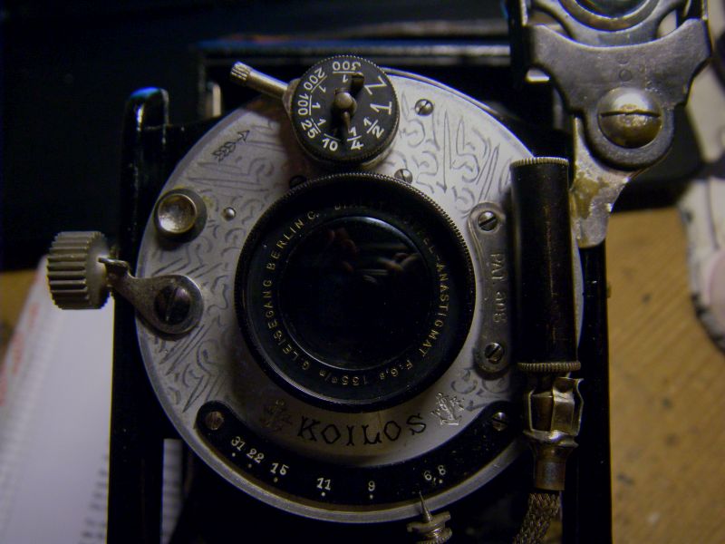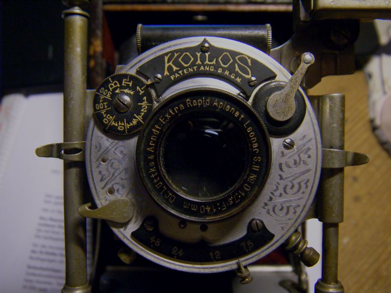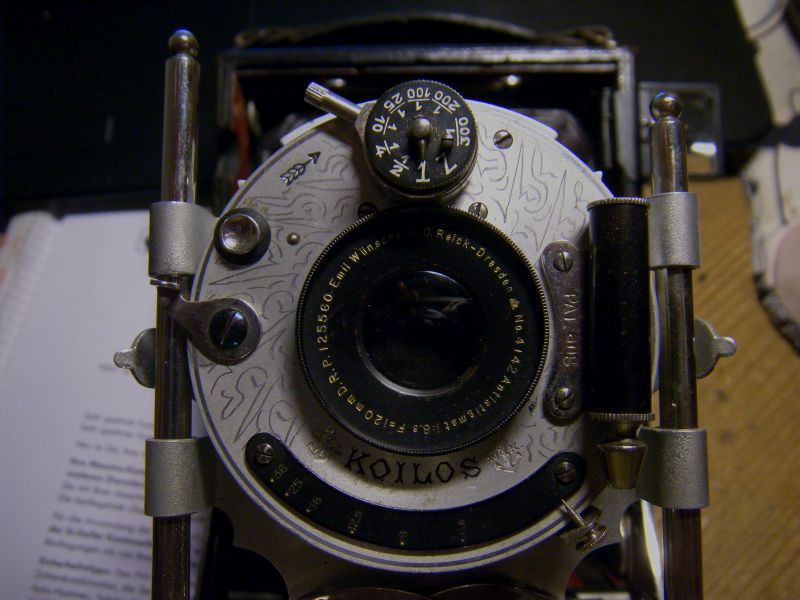 Es gehört einer Bülter+Stammer 9x12, Derogy 6,8/135mm, Luftbremsen-Koilos: Vermulich hat jemand die schwarze Farbe auf dem "Koilos"-Schild und dem Blendenanzeiger entfernt, darunter kam das Messing hervor. Das ist aber so gut gemacht, dass die Schrift in keinster Weise in Mitleidenschaft gezogen worden ist. Die Messingumrandung des Objektivs scheint Original zu sein.
