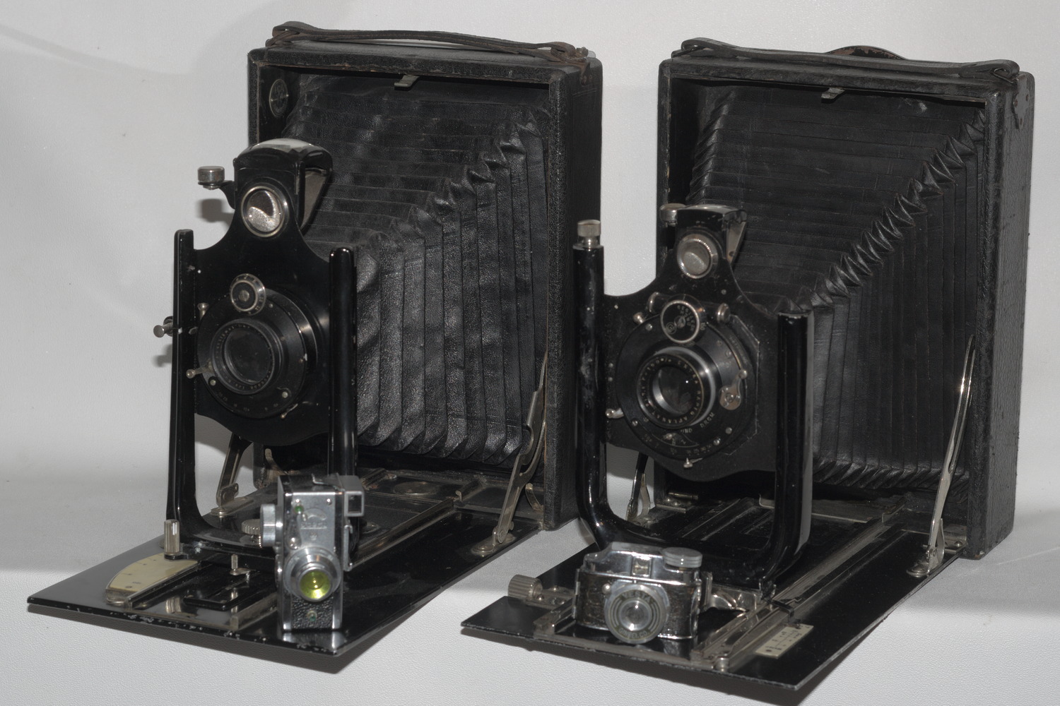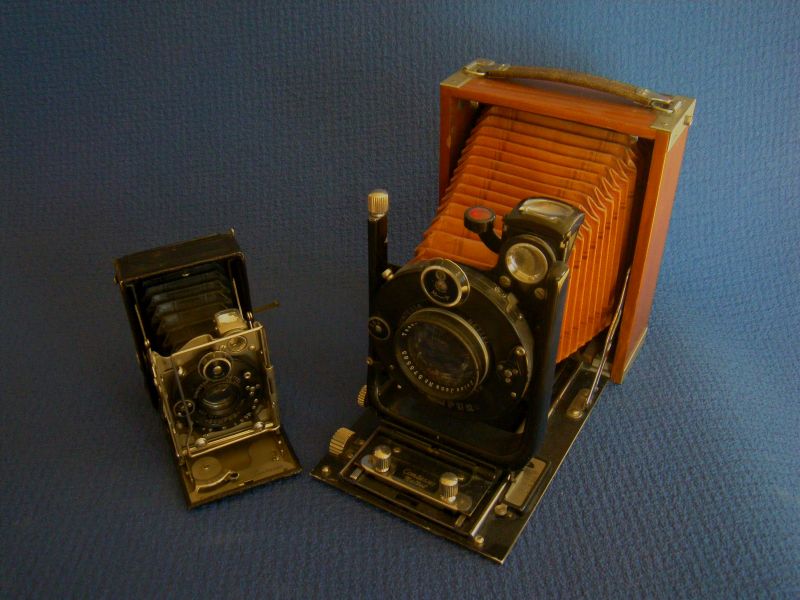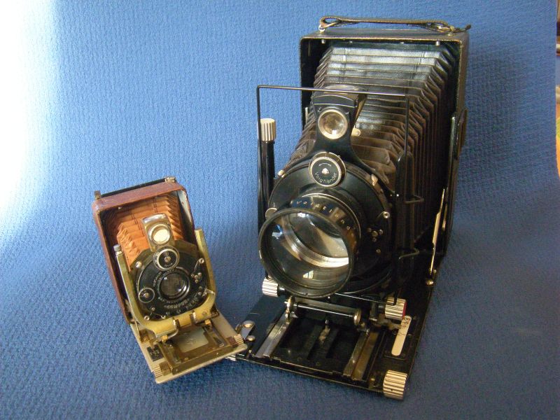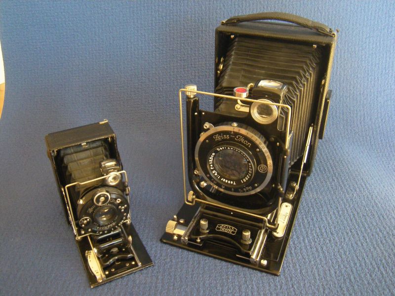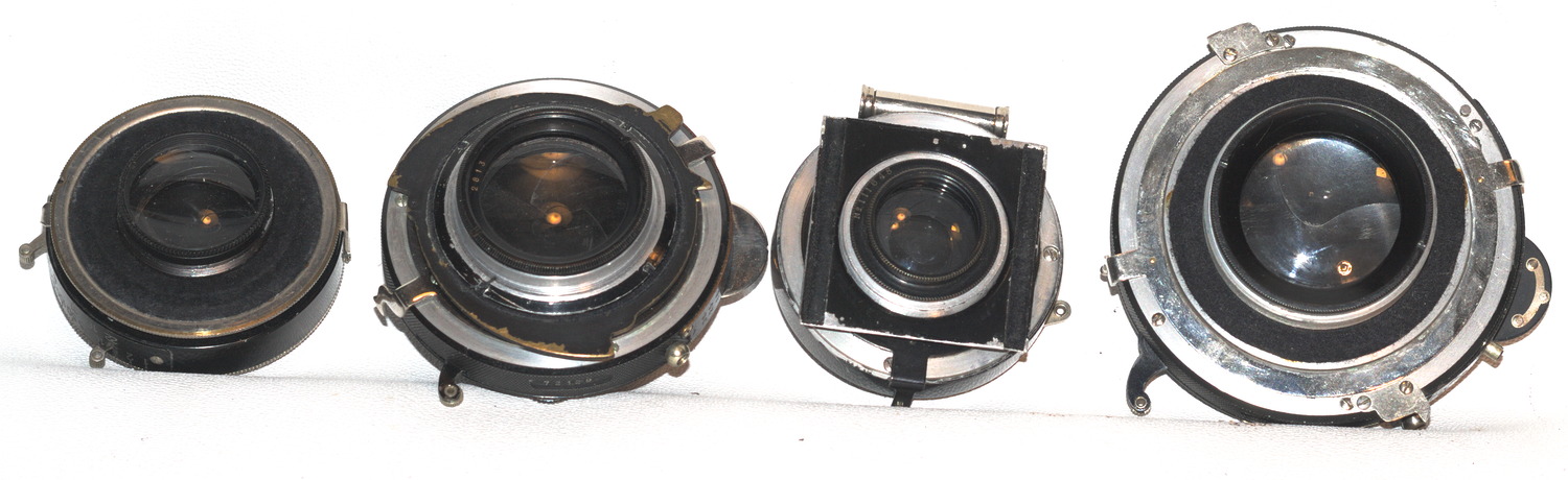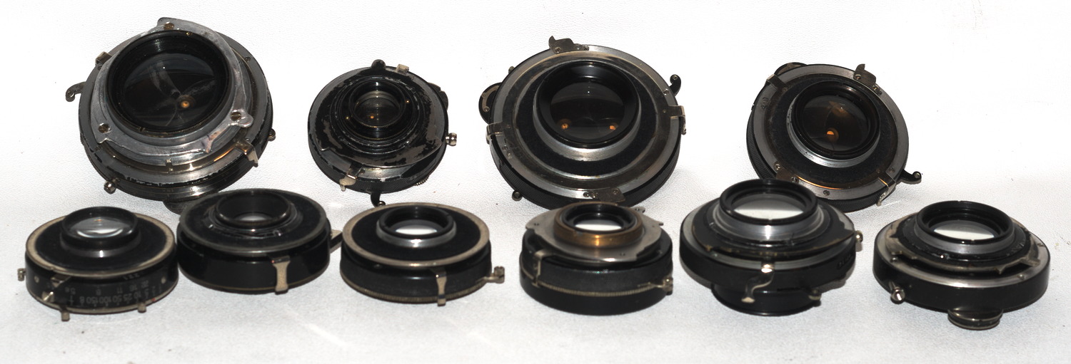 anbei meine größten und kleinsten - Kameras 13x18cm (Balda, ICA Volta 355) bzw. 10x14mm (Steky IIIB) und 14x14 (Ginrei Vesta) bzw. Objektive (Krauss Trianar 20mm, Triplet mit Irisblende; Pacific Optical 1:6, 604mm ('in' Sinar-Platte), Tessar-Typ ohne Blende).