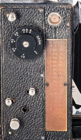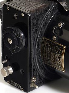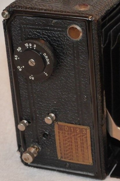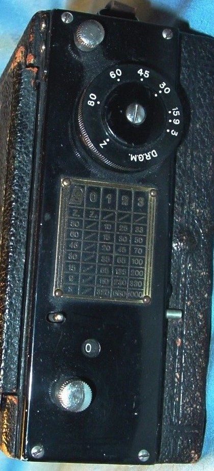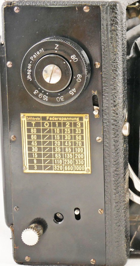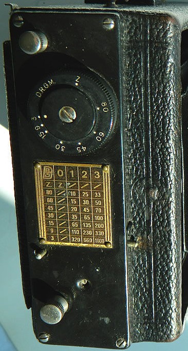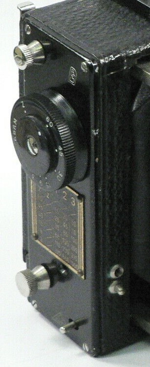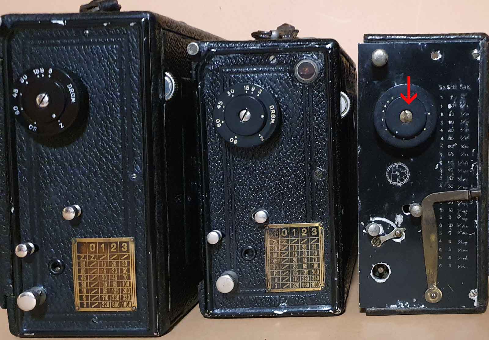 Ihagee Schlitzverschluss-Kameras besitzen übrigens nur einen ähnlichen Zeiten- / Aufzugsknopf, sind ansonsten aber ganz eigene Konstruktionen. Hier als Beispiel die Ihagee Patent-Dublex Zweiverschlusskamera 9x12: