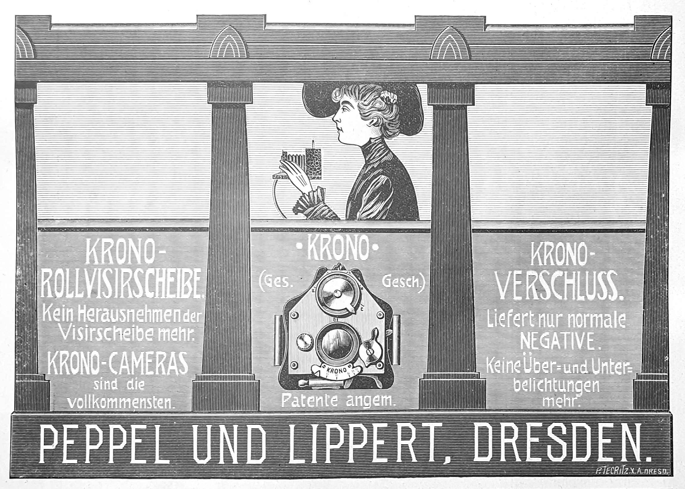 Im Web und bei Thiele findet sich der Hinweis, dass die „Fabrik photographischer Apparate Peppel & Lippert“ 1902 gegründet wurde. Der Handelsregistereintrag der Firma datiert aber erst auf das Jahr 1904. Eventuell war ja die Erfindung des Krono-Verschlusses durch Johannes Rudolph Alfred Lippert im Jahr 1904 ausschlaggebend dafür, dass der Produktionsumfang der Firma einen Handelsregistereintrag erforderte. In jedem Falle scheint der Kaufmann Peppel die finanzielle Grundlage für die Produktion der Verschlüsse und Kameras geliefert zu haben. (Der Vorname von Peppel ist nicht ganz klar: In der aktuellen Literatur wird Karl Peppel genannt. Im Patent für den Krono-Verschluss und im Dresdner Adressbuch 1903 findet sich der Name Otto Peppel)