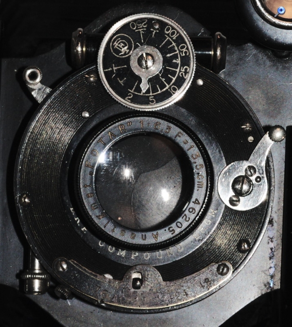 Das Fotar hatte ich zwar mit der Kamera gekauft, aber nicht mit diesem Verschluß sondern einem Vario (es dürfte ursprünglich auch nicht zur Kamera gehört haben). Die Blendenwerte stimmen aber, und die am Schild nicht gravierte 6.3 läßt sich trotzdem klaglos einstellen.
