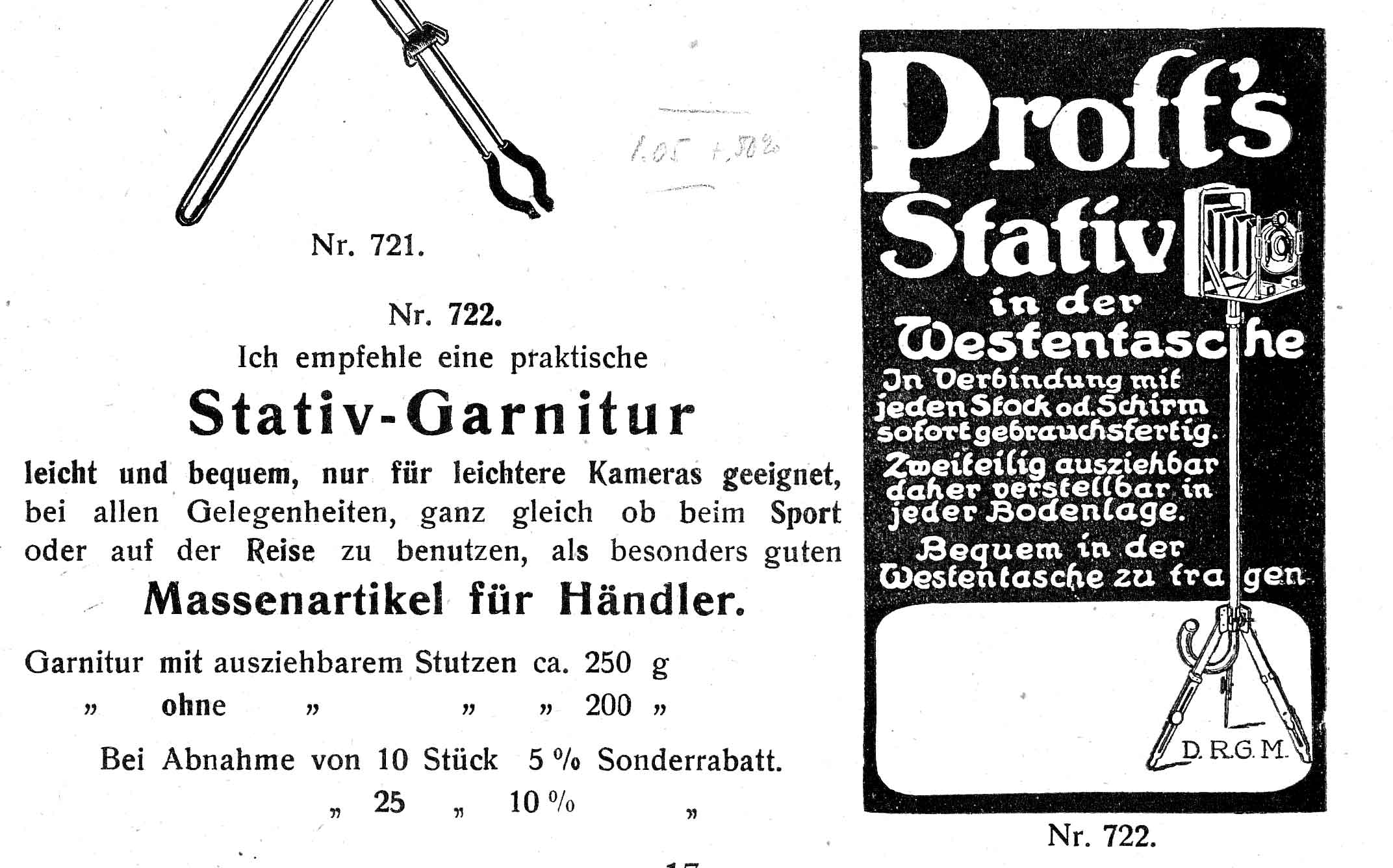 Die zeitgenössischen Zeitschriften vermelden im Jahr 1921 "Proft in Meißen bringt ein Hilfsstativ in den Handel ( D. R. G. M.) ...". Deshalb würde ich den Katalog ab 1921 datieren, auch wenn Proft den Gebrauchsmusterschutz wahrscheinlich bereits am 20. Mai 1916 erhalten hat.