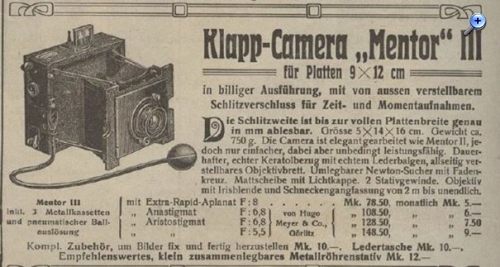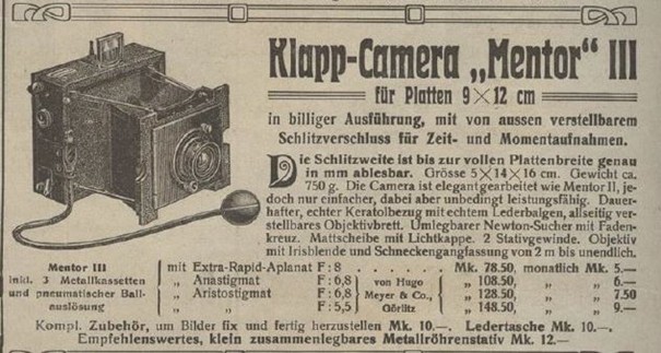 ...Gefertigt werden zunächst Klappkameras mit Schlitzverschluss – damals das Modernste vom Modernen. Aber die Konkurrenz war gross: Goerz mit seiner Anschütz-Kamera war sicherlich der Vorreiter (ab 1896). Aber auch Bentzin mit seiner «Primar»-Kamera (ab 1902), Zeiss mit seiner «Palmos»-Kamera (ab 1900) und Nettel mit seinem gedeckten Verschluss = Deck-Rollo (ab 1906) buhlten um Kundschaft. In diesem Umfeld schaffte es Goltz & Breutmann eine Schlitzverschluss-Kamera herzustellen und zu vermarkten, die weltweit Anklang fand, von vielen, auch etablierten Kamera-Herstellern und Händlern ins Progamm genommen wurde und sich über Jahre halten konnte. Die Kamera hiess «Mentor» II (eine Mentor I gab es nie!). Sie besass vier Stahlstabspreizen die in vier kurzen Schlitzen oben und unten am Objektivbrett gleiten (D.R.G.M. 105993). Ausserdem besass sie einen ungedeckten, von aussen verstellbarem Rouleaux-Verschluss (bis 1/1300 Sek.) mit der D.R.G.M. No. 170980. Es gab sie in den Grössen 9x12, 13x18 und 9x18 (Stereo). Später kam die Mentor III auf den Markt. Dies war eine abgespeckte Mentor II: einfacheres Material, Objektivbrett und Objektivbestückung. Bis 1905 erschien Goltz & Breutmann nicht als Hersteller dieser Kamera in den Anzeigen. Erst ab 1906 vermarktete die Firma ihre Kameras unter eigenem Namen. Andere Kamera-Hersteller, die diese Kamera in ihrem Programm hatten: • Busch, Emil / Rathenow (1906) «Heda»=Mentor III / «Roja»=Mentor II • Ernemann / Dresden (1901) «Klappkamera» • Falz & Werner / Leipzig «Klappkamera» • Krauss, E. / Paris (1906) «Tykta» und «Takyr-Krauss Modele I» • Krügener / Frankfurt (1908) «Schlitzverschluss-Camera» • Plaubel / Frankfurt (1902) «Autoroll» • Spitzer, Otto / Berlin (1910) «Gasparone» • Suter / Basel «Klappkamera»