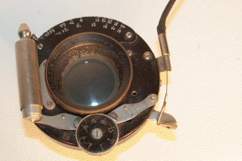von all diesen schönen frühen Typen habe ich nur einen vom Stil B. Der zugehörige Verschluß ist mir unbekannt - kennt ihn jemand? In diesem Verschluß sitzt ein schöner früher, unnumerierter Rodenstock-Doppel-Anastigmat, ein Heligonal. Der zweite Zylinder, dessen Anschlußmöglichkeit zu sehen ist und der für den pneumatischen Auslöser wäre, fehlt. Warum das so ist, ist mir unklar. Es könnte z.B. sein, daß das von Anfang an so war im Sinne eines Übergangs auf einen Drahtauslöser; der Drahtauslöser könnte nachträglich montiert worden sein und dabei der Zylinder entfernt; oder der Zylnder könnte verloren gegangen und durch einen Drahtauslöser ersetzt worden sein. Natürlich wäre auch möglich, daß am Anfang pneumatischer und Drahtauslöser vorhanden waren. Zwar würde auch noch die pneumatische Auslösung funktionieren, aber das anschließende Schließen des Verschlusses nicht mehr richtig.